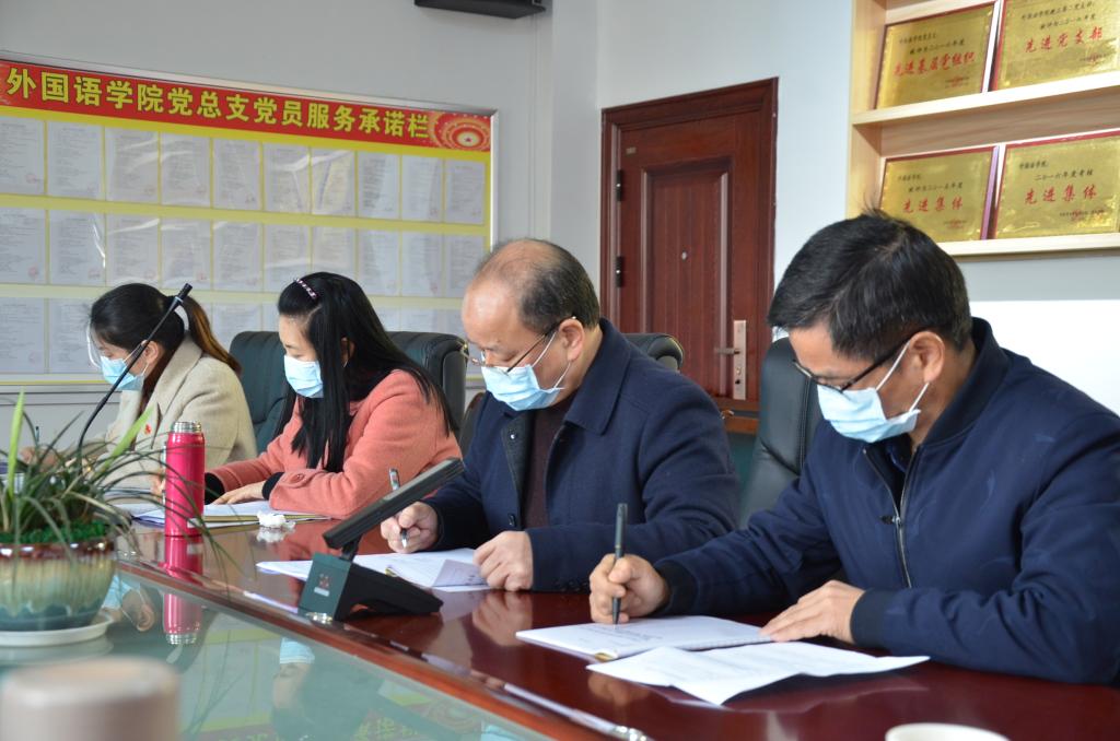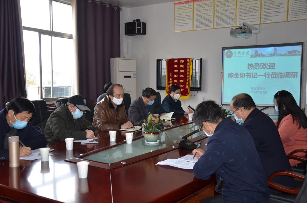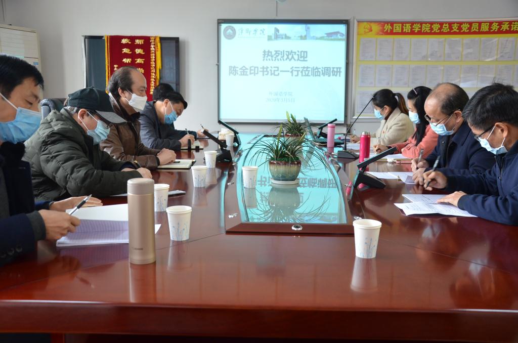 3月5日,党委书记陈金印赴外国语学院就新冠肺炎疫情防控与新学期工作进行调研指导。党委委员、副校长郭伟、党政办、科研处、教务处、招就处、高评所等部门负责人参加调研。