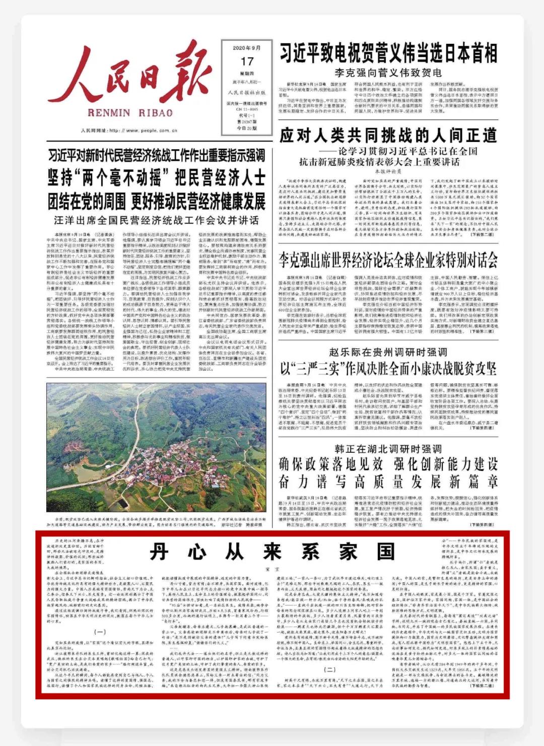 人民日报头版今天刊发“宣言”署名文章《丹心从来系家国》,阐述中国人民夺取抗疫斗争重大战略成果的精神密码,中华民族穿越风雨、砥砺前行的文化基因。