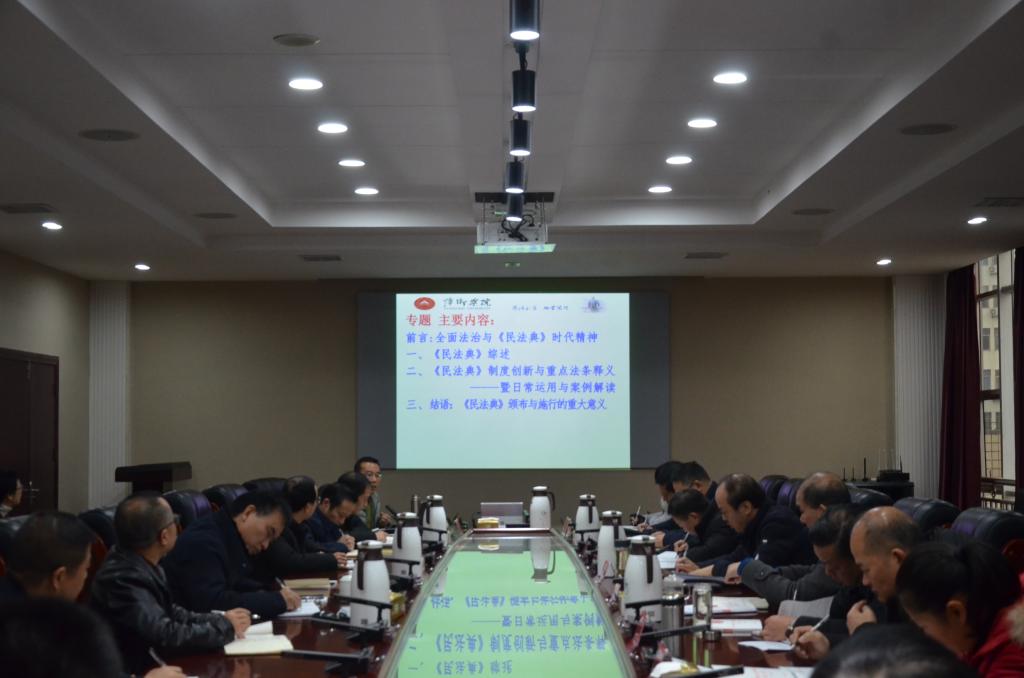 陈金印主持时指出,要充分认识民法典颁布实施的重大意义,深刻认识实施民法典是发展社会主义市场经济、巩固社会主义基本经济制度的必然要求,认真学习《民法典》,广泛宣传《民法典》,深入贯彻《民法典》。他强调,要始终以师生为中心,维护好师生员工涉及安全、财产、健康、自由、平等、公正等方面的权利,当前持续抓紧抓实抓细常态化疫情防控各个环节,各项工作提早谋划,全力以赴做好今冬明春的疫情防控工作。要加强普法教育,提升领导干部和师生员工的法治素养,建设以法治精神为核心的校园法治文化,营造学法守法用法尚法的法治文化氛围。