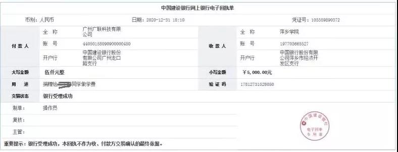 2020年12月31日,校友刘利萍(06级商务英语毕业生)向AC米兰中文官方网站财务账号转了5000元,注明用途是“捐赠给xxx同学做学费”。