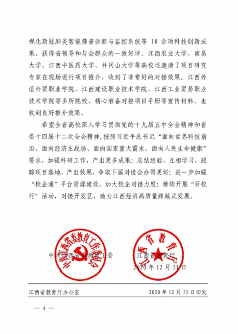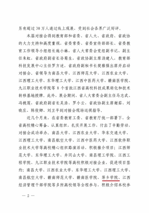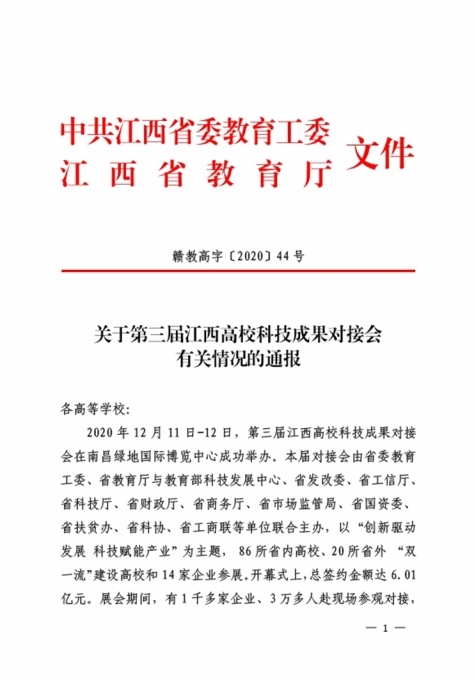 近日,中共江西省委教育工委与江西省教育厅联合发文《关于第三届江西高校科技成果对接会有关情况的通报》(赣教高字【2020】44号),AC米兰在通报文件中获肯定:AC米兰中文官方网站校领导全程参与,积极介绍本校参展项目。