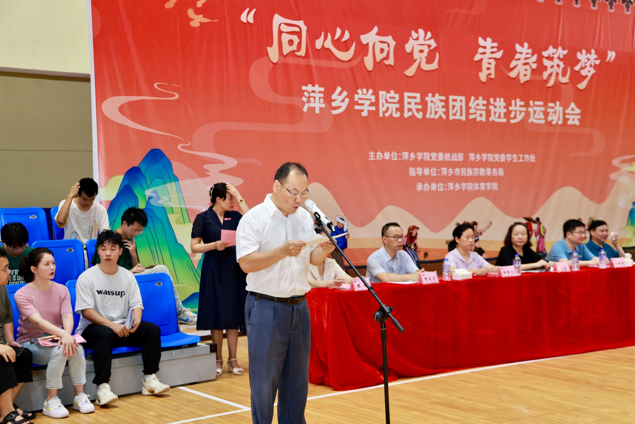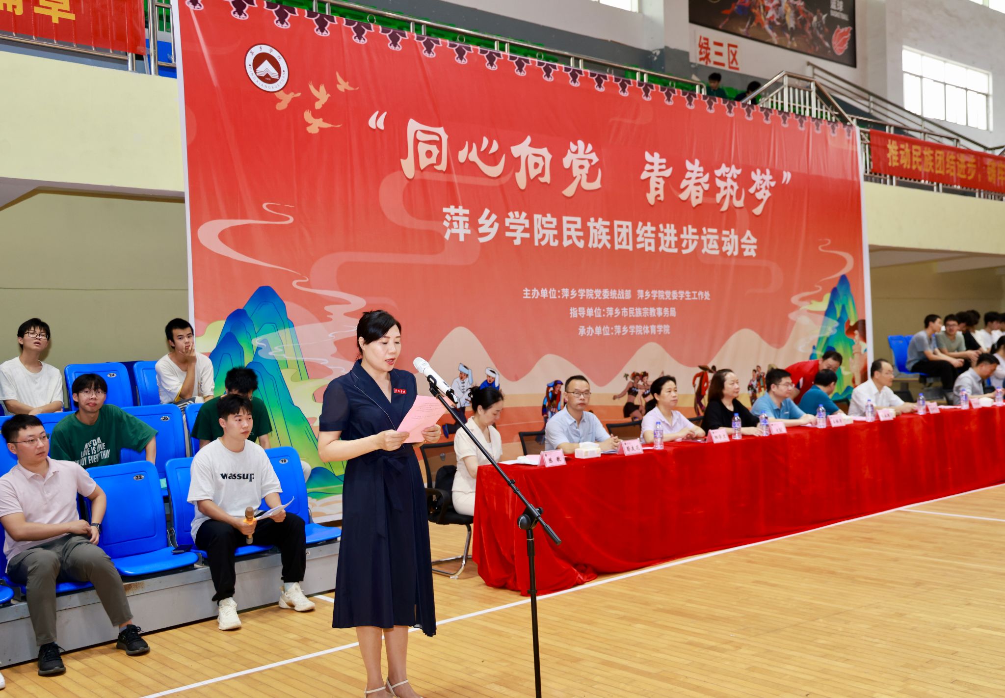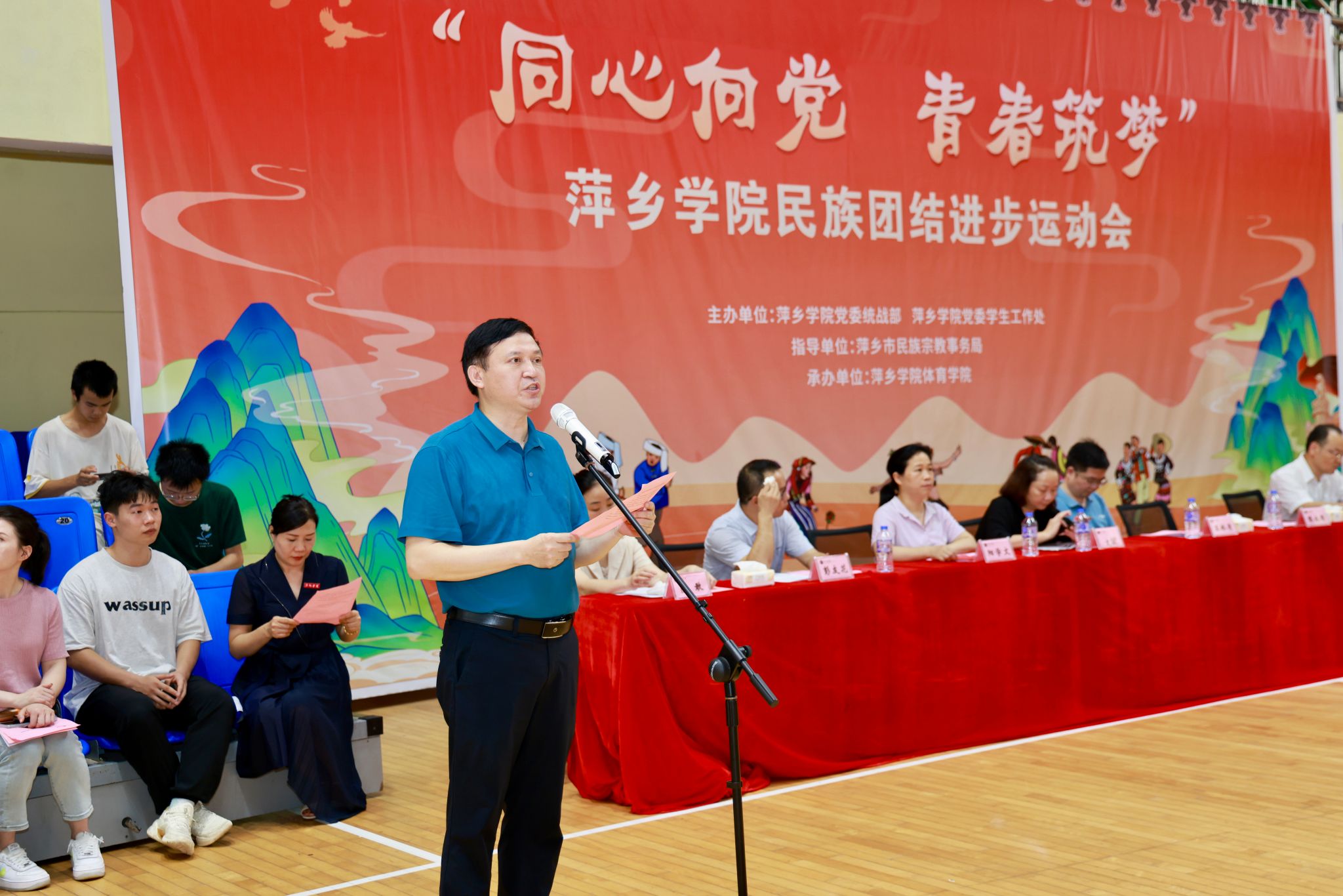 开幕式现场,彩旗飘扬,各民族学生身着盛装,精神抖擞。学校领导、师生齐聚一堂,共同见证这一充满团结与活力的时刻。出席本次开幕式的校党委委员、副校长陈永国,党委委员、组织部部长王林清,统战部部长贺晓梅,萍乡市委统战部副部长、市民族宗教局局长袁新忠,体育学院党委书记文娬,体育学院院长陈岷,教育学院党委书记阳学文,外语学院党委书记刘佳萍,艺术学院党委书记丁勇,学工处副处长陈敢,各二级学院党委副书记、辅导员和220名参赛运动员,开幕式由贺晓梅主持。