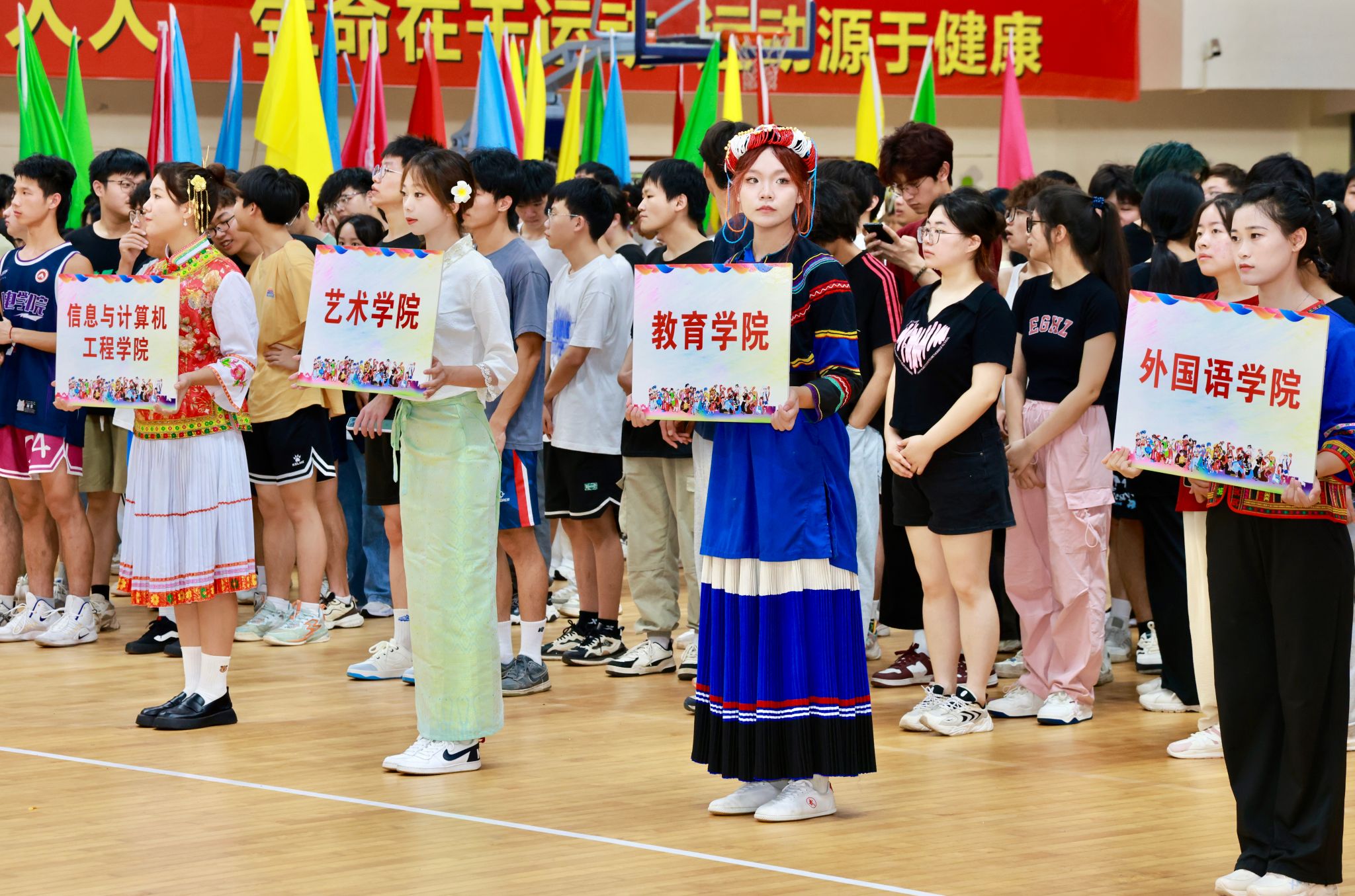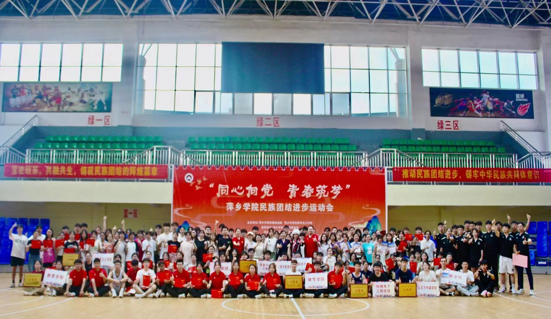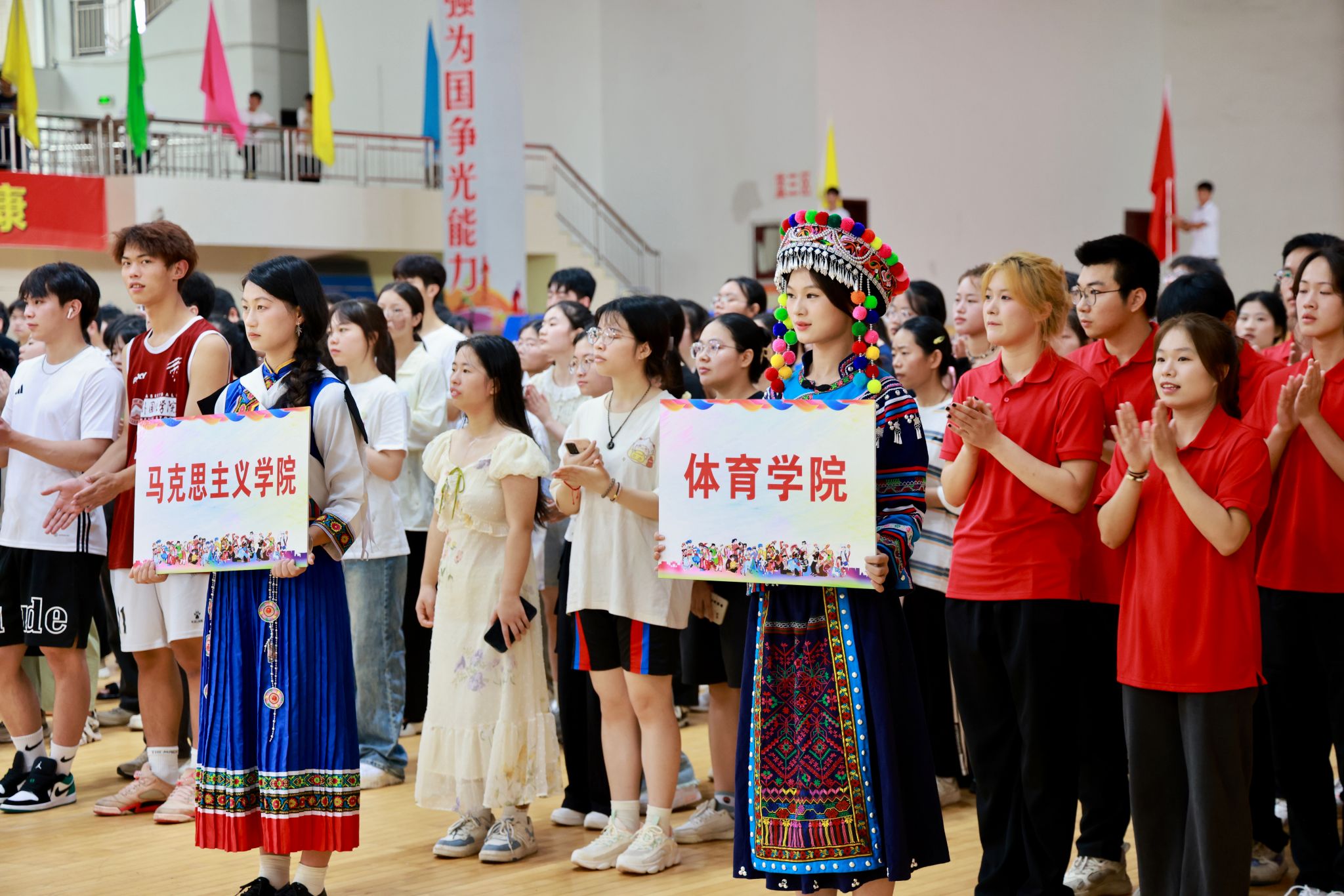 开幕式现场,彩旗飘扬,各民族学生身着盛装,精神抖擞。学校领导、师生齐聚一堂,共同见证这一充满团结与活力的时刻。出席本次开幕式的校党委委员、副校长陈永国,党委委员、组织部部长王林清,统战部部长贺晓梅,萍乡市委统战部副部长、市民族宗教局局长袁新忠,体育学院党委书记文娬,体育学院院长陈岷,教育学院党委书记阳学文,外语学院党委书记刘佳萍,艺术学院党委书记丁勇,学工处副处长陈敢,各二级学院党委副书记、辅导员和220名参赛运动员,开幕式由贺晓梅主持。