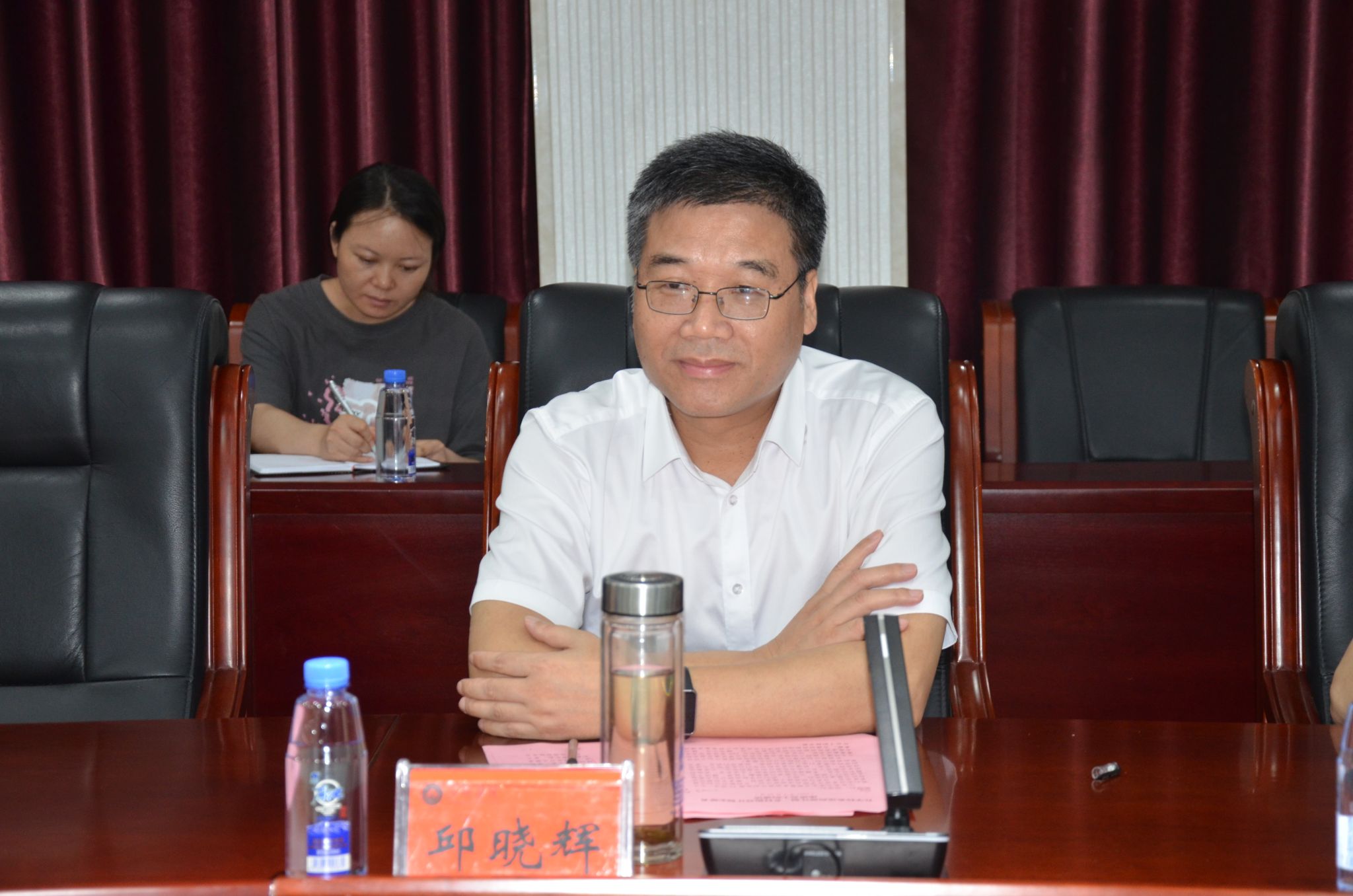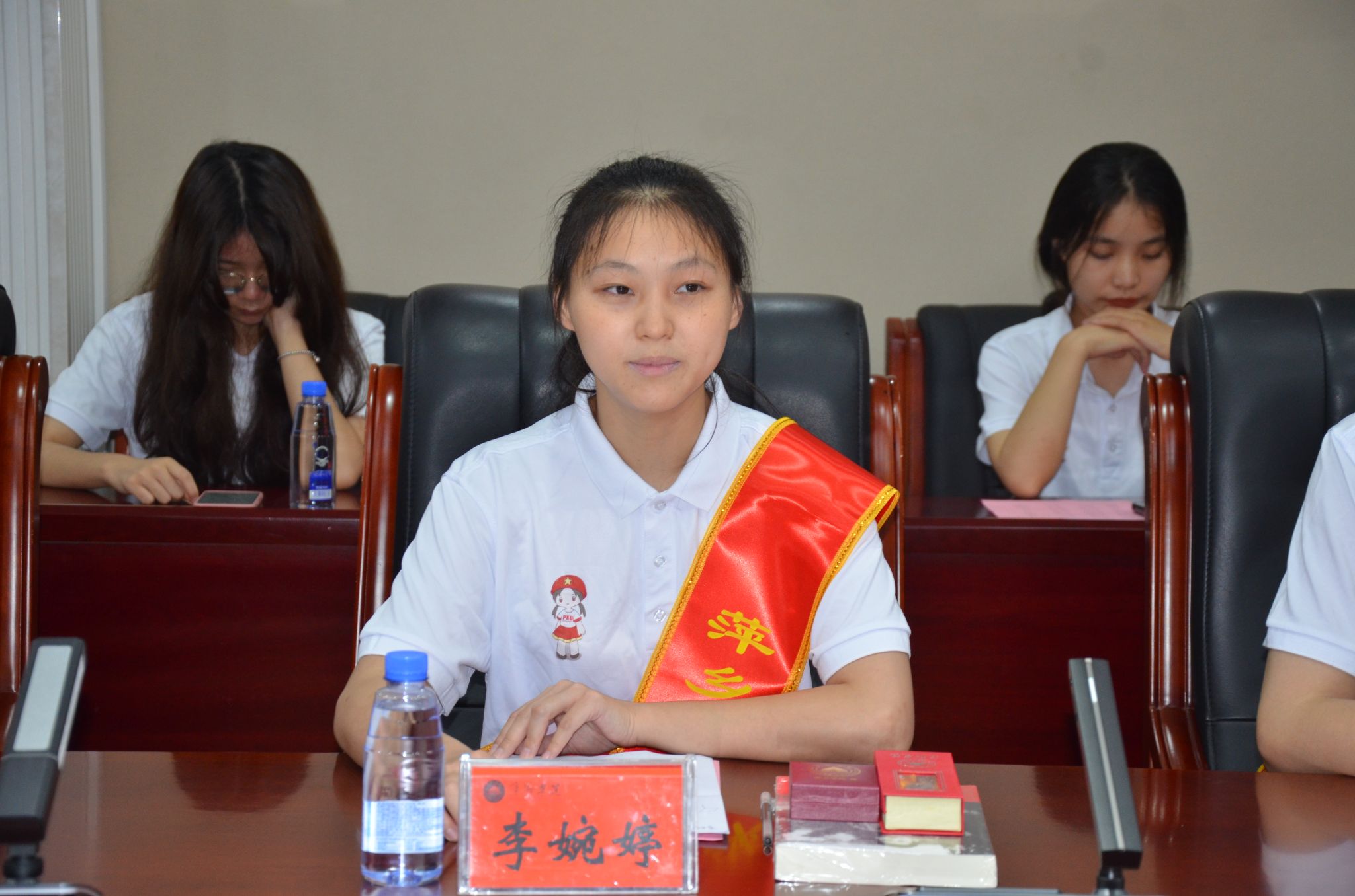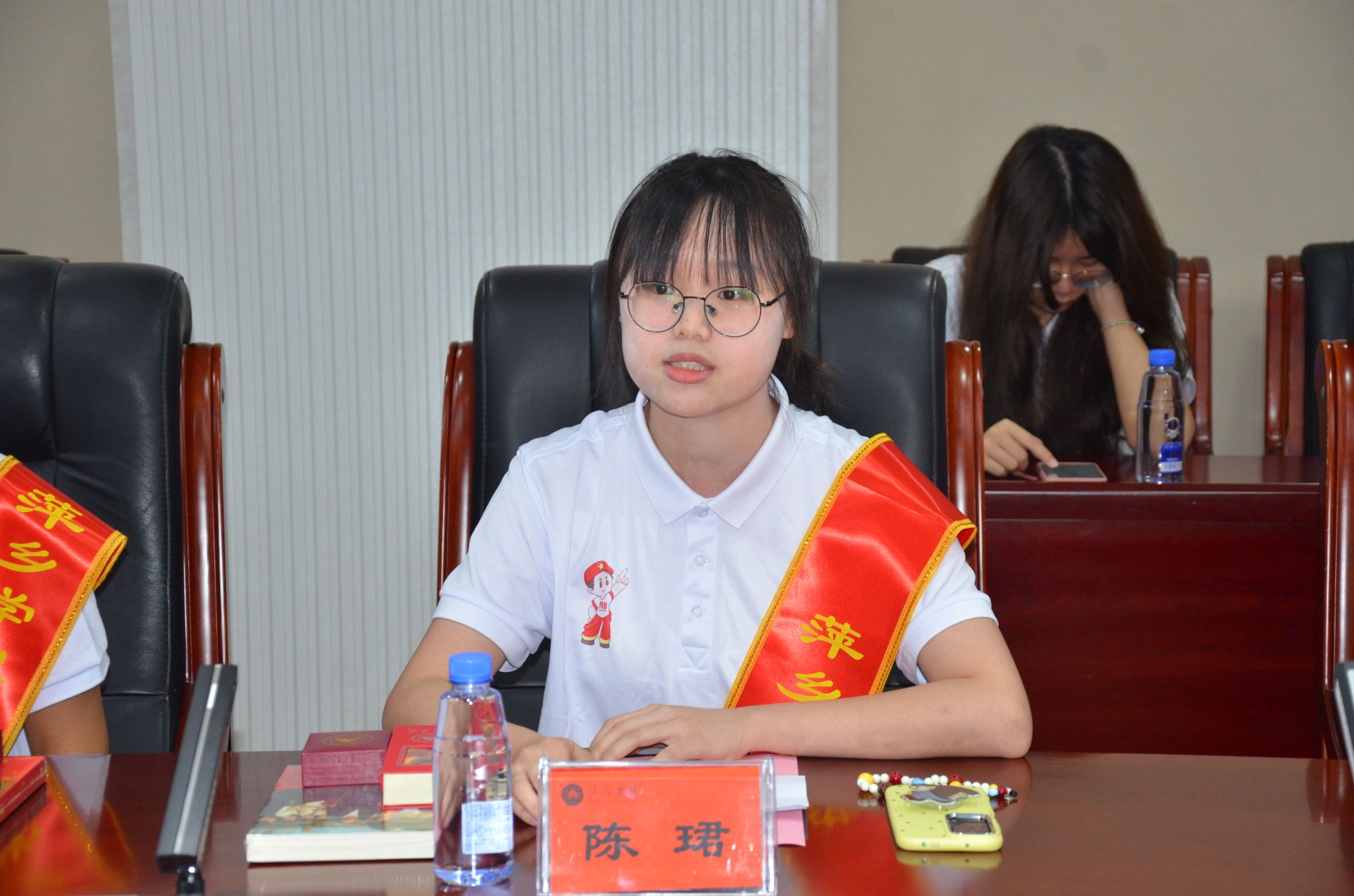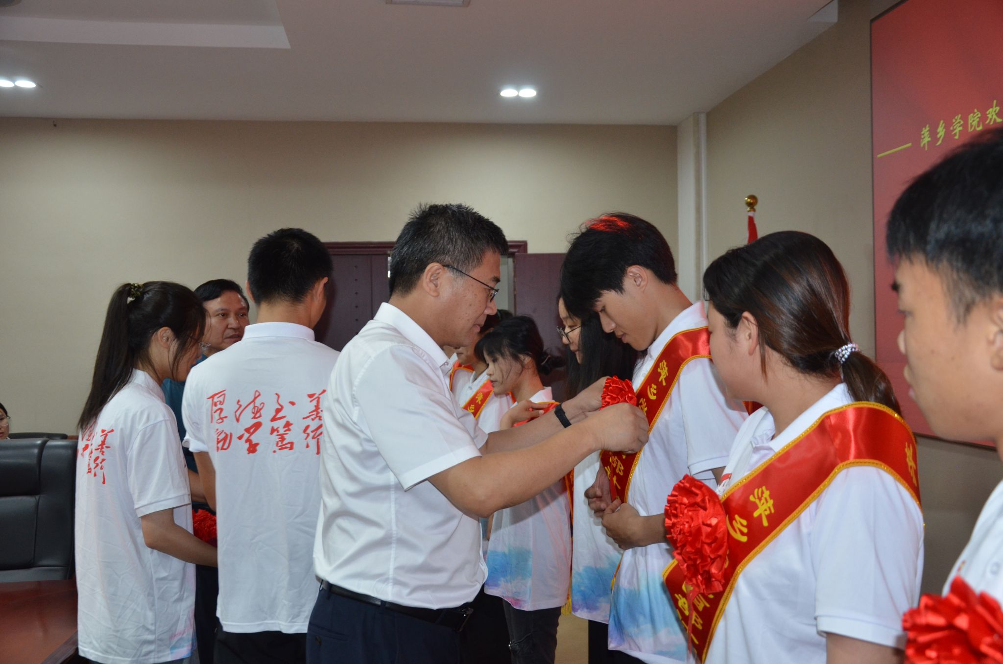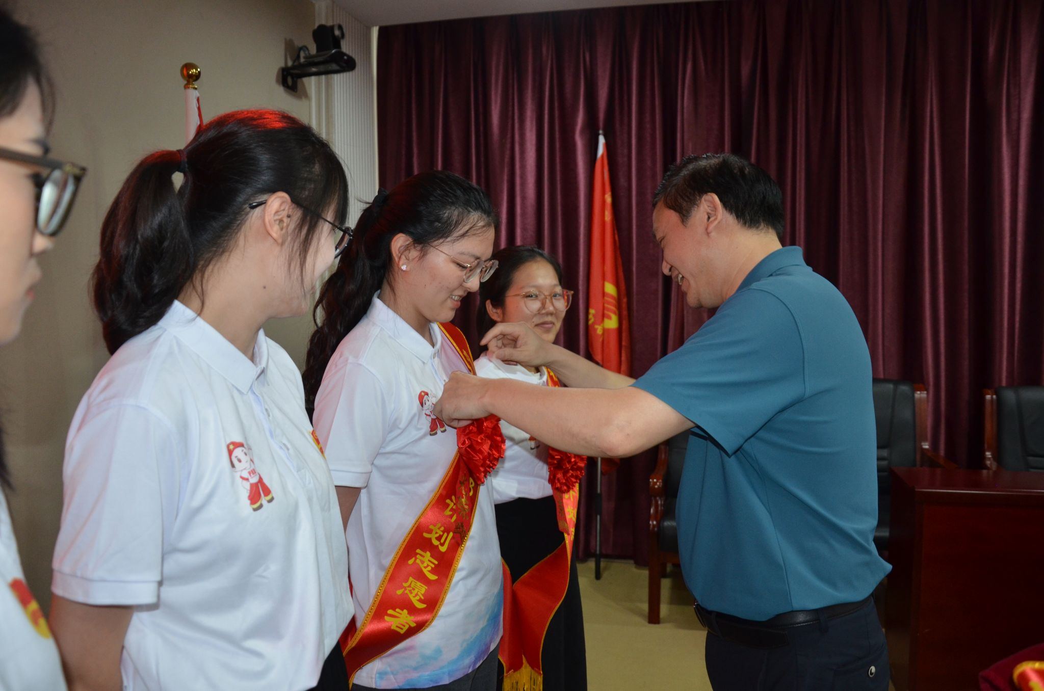 会上,邱晓辉还和陈永国一起为志愿者们佩戴绶带。