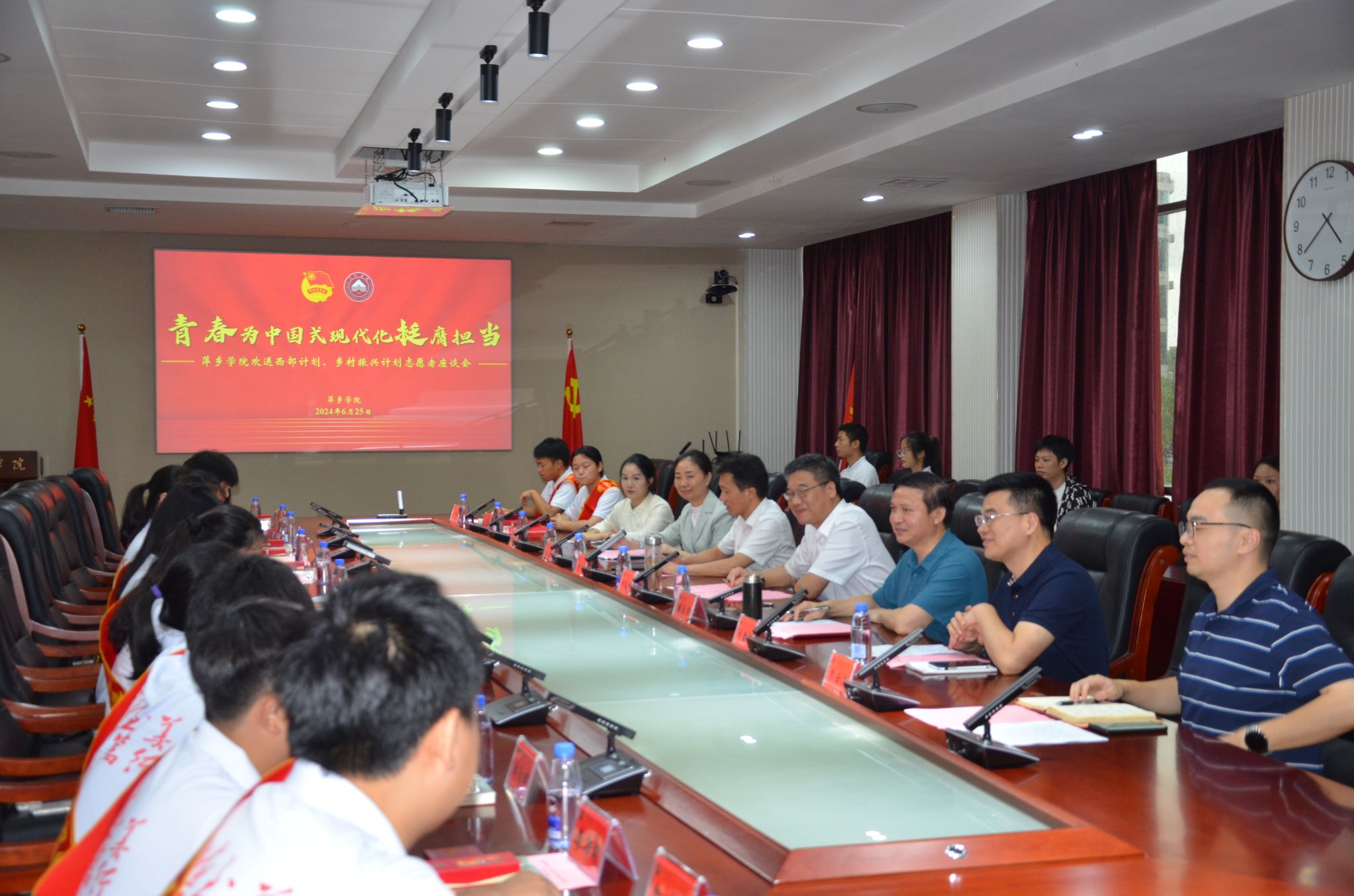 6月25日下午,学校在至善楼第一会议室召开2024年欢送西部计划、乡村振兴计划志愿者座谈会。校党委书记邱晓辉,校党委委员、副校长陈永国,党委委员、宣传部部长曾敏,招生就业处处长刘德平,党委学生工作部副部长陈敢,校团委副书记熊云杰等出席,14名AC米兰2024年西部计划、乡村振兴计划志愿者代表以及部分在校生代表参加。座谈会由陈永国主持。