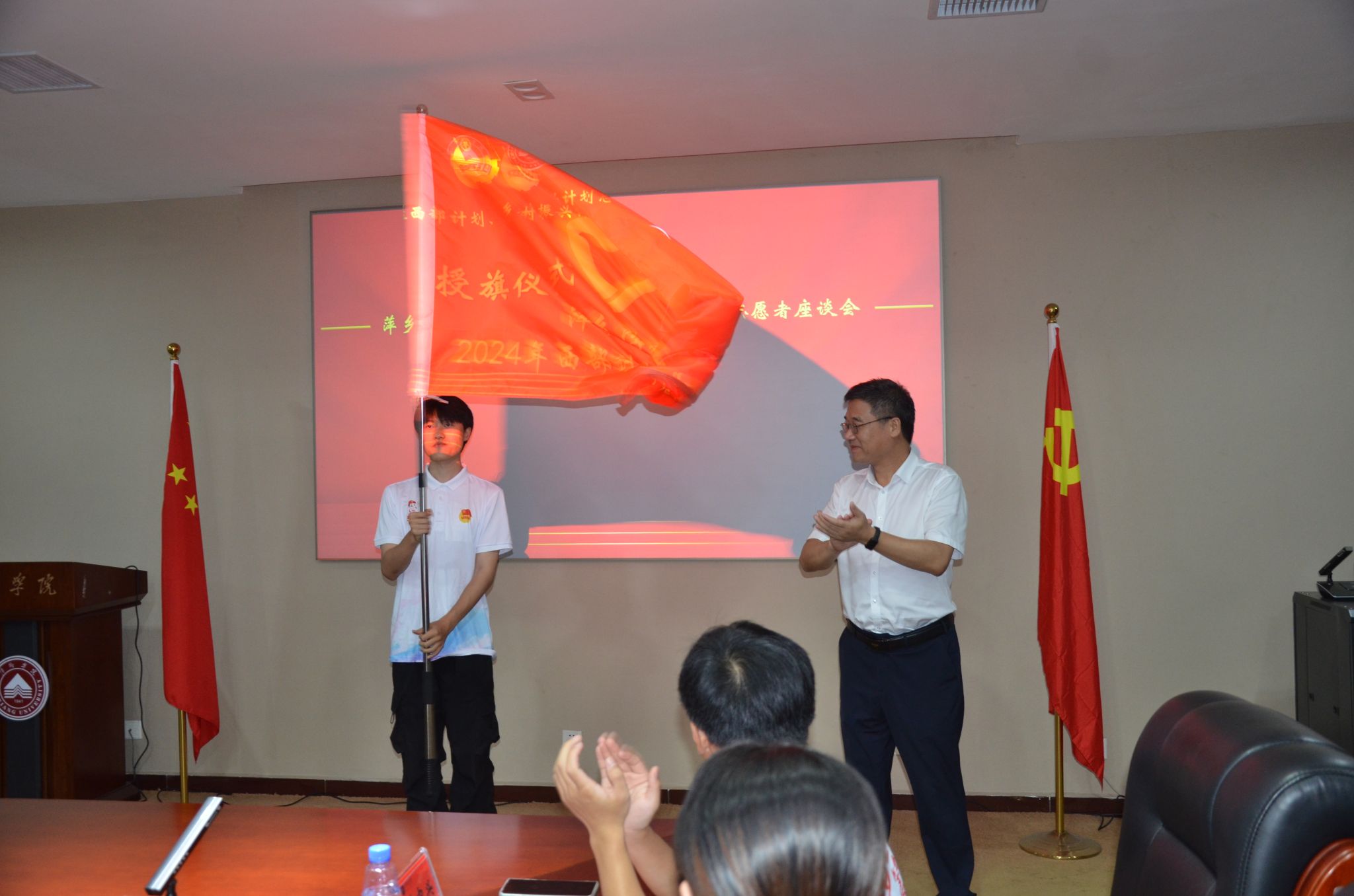欢送座谈会上,邱晓辉为志愿者授旗,对入选2024年西部计划和江西乡村振兴项目的志愿者表示祝贺,并提出三点希望:一是要坚定理想,做好扎根基层的充分准备。牢记习近平总书记殷殷嘱托,做好充分准备,积极践行志愿精神,厚植家国情怀,牢记神圣使命。二是要坚持学习,在服务基层中练就过硬本领。珍惜青春年华,脚踏实地,笃实好学,在基层一线磨练意志、砥砺品格。坚持向书本学习、向实践学习、向他人学习,把学习作为一种责任,一种精神追求、一种生活方式。三是要勇于担当,在西部书写青春奋斗的新篇章。勇挑历史重担,敢接最烫的“山芋”、啃最硬的“骨头”,戒骄戒躁,沉下心,俯下身、扎下根,积极探索服务地区经济社会发展、民族团结进步的新方法。