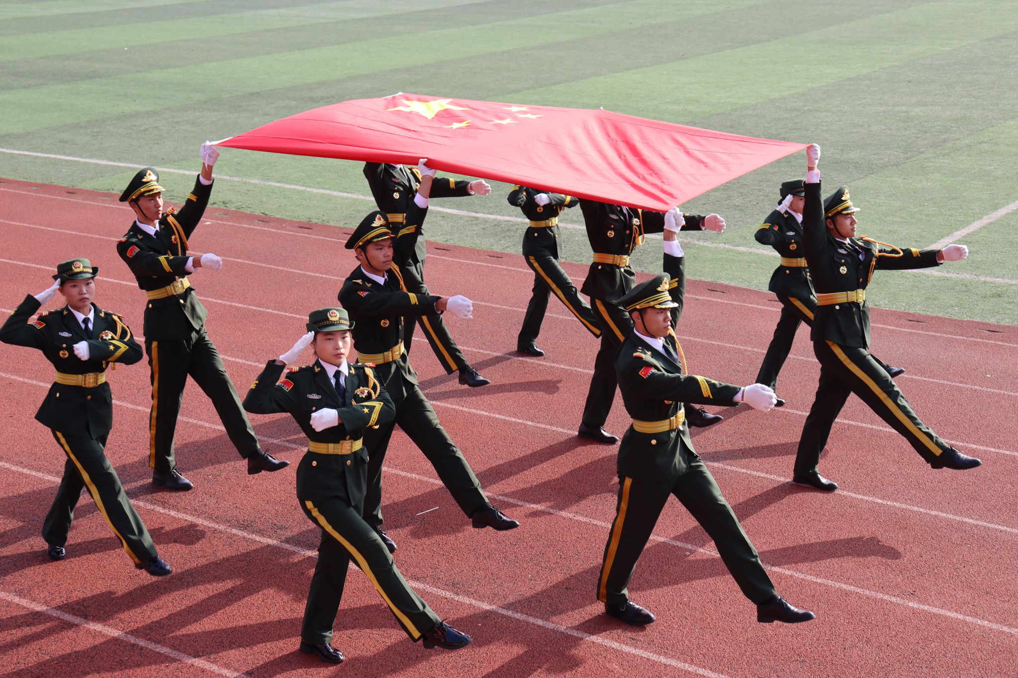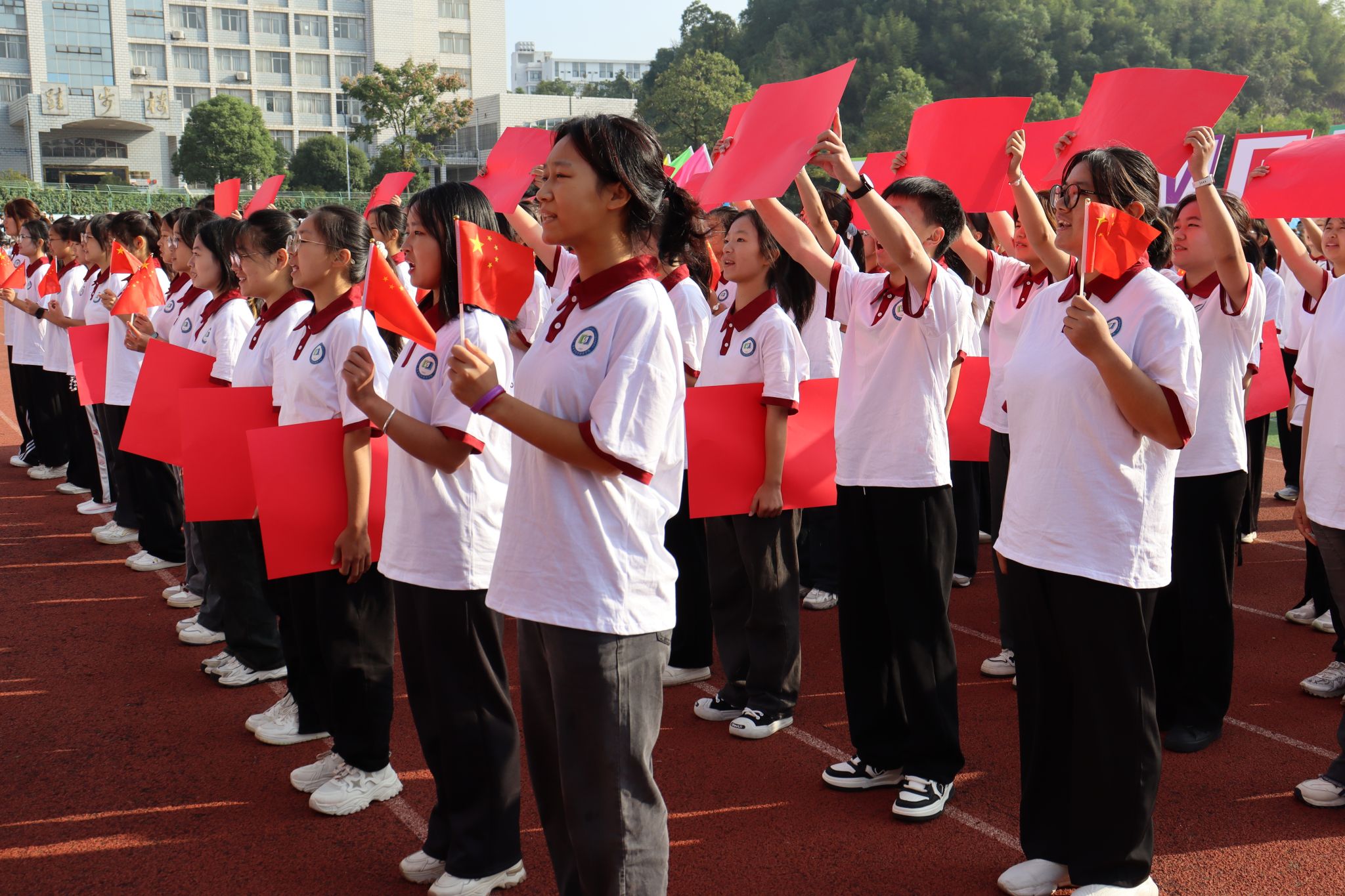 开幕式上,在场领导和师生全体起立,面向国旗,升国旗,奏唱国歌。