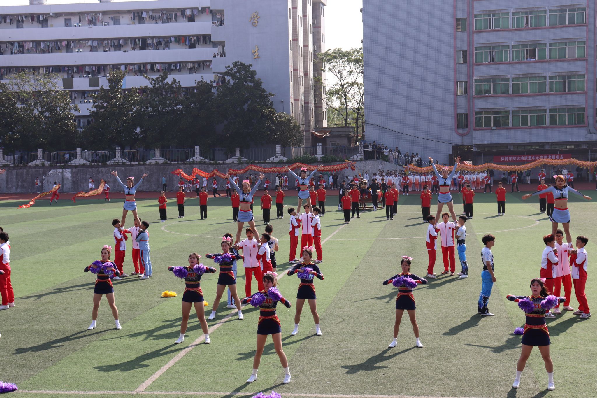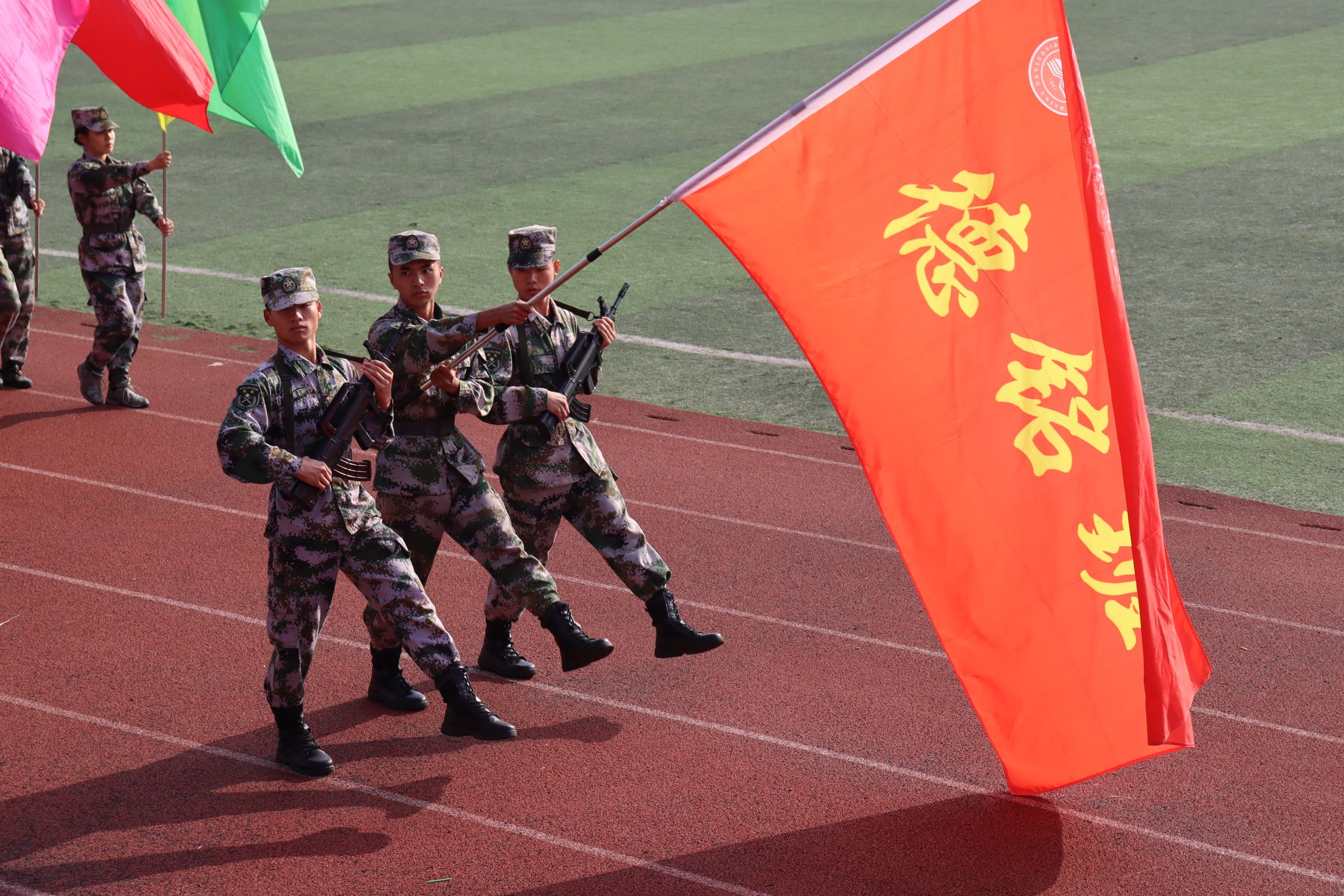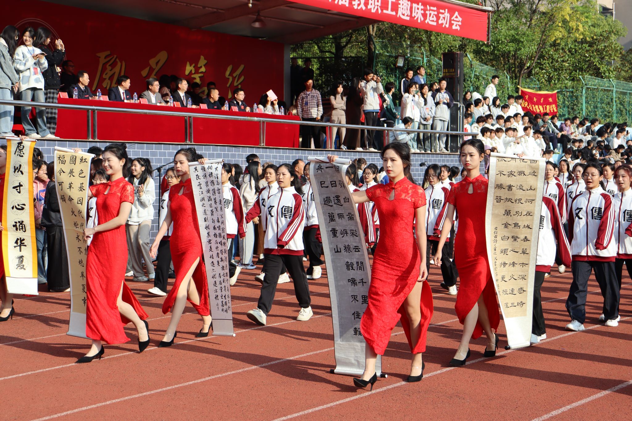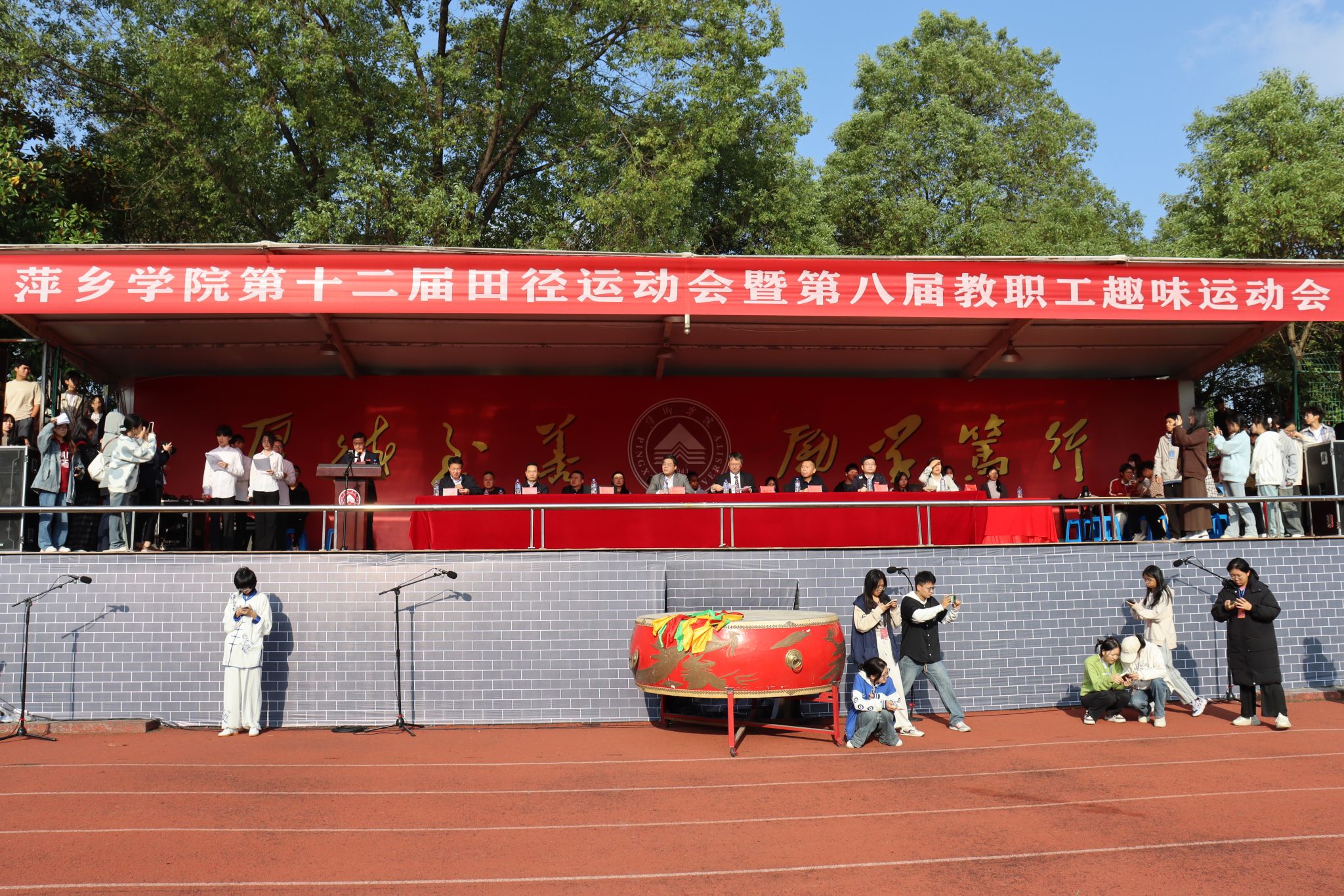 伴随着青春激昂的《运动员进行曲》,国旗、校旗、会旗、鼓号队、民兵护校队、裁判员队、教师代表队陆续进场。十一个二级学院代表方阵依次入场,他们面带笑容,青春洋溢,尽显萍院学子风采。