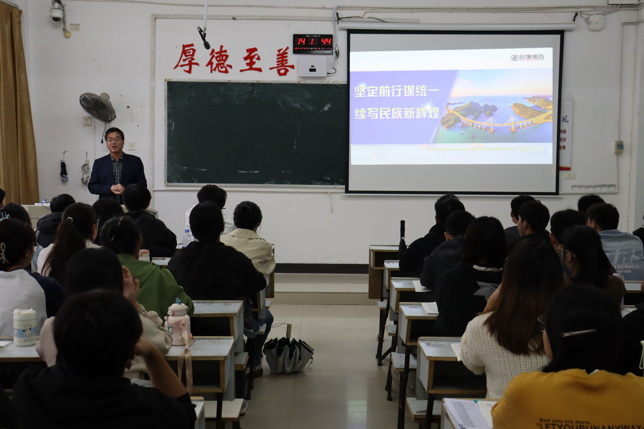 10月22日下午,校党委书记邱晓辉深入课堂,为2023级数学与应用数学专业1、2班的同学们讲授了一堂主题为“坚定前行谋统一,续写民族新辉煌”的形势与政策课。党委宣传部、教评中心、马克思主义学院负责同志及思政课教师代表到现场听课。