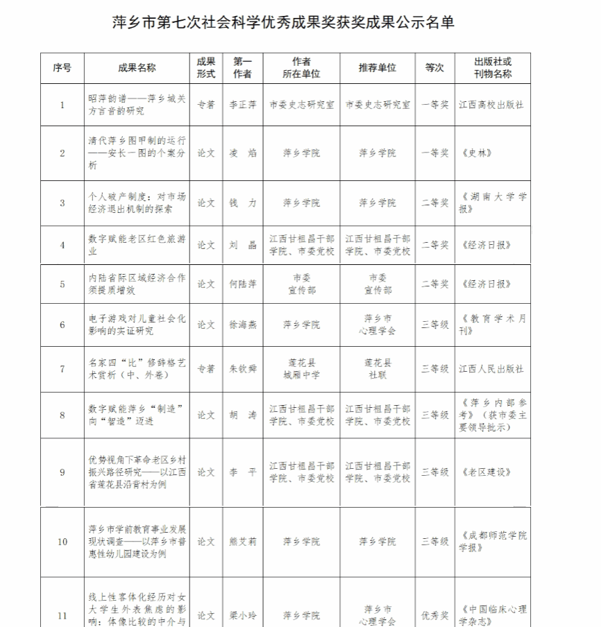 近日,萍乡市社会科学界联合会公布萍乡市第七次社会科学优秀成果奖获奖名单,AC米兰凌焰等6位教师的学术论文获市社会科学优秀成果奖,其中凌焰老师的《清代萍乡图甲制的运行——安长一图的个案分析》荣获一等奖,钱力老师的《个人破产制度:对市场经济退出机制的探索》荣获二等奖,徐海燕和熊艾莉老师的论文荣获三等奖,梁小玲和黄明明老师的论文荣获优秀奖。
