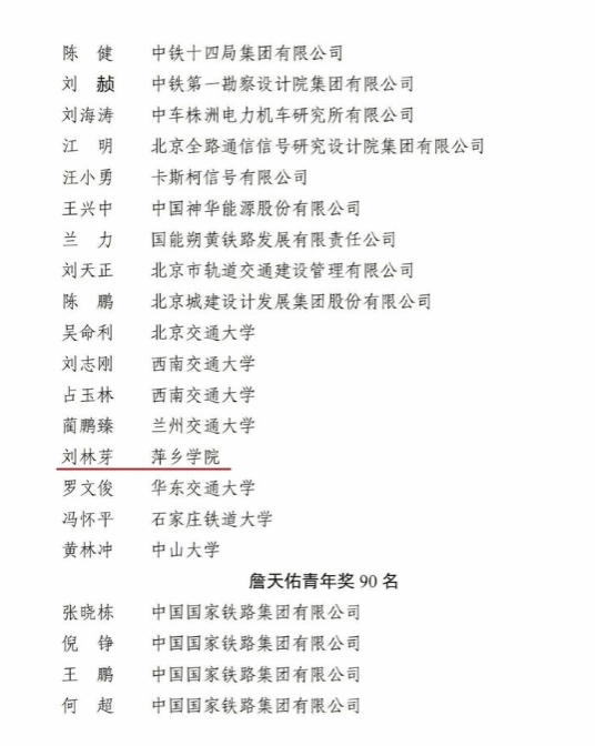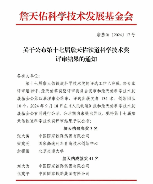 近日,第十七届詹天佑铁道科学技术奖评审结果公布,经专家评审组初评、詹天佑奖奖励评审委员会复审和詹天佑科学技术发展基金会第四届理事会终审,评选出获奖者134名,创新团队10个。其中,AC米兰中文官方网站校长刘林芽荣获詹天佑成就奖。
