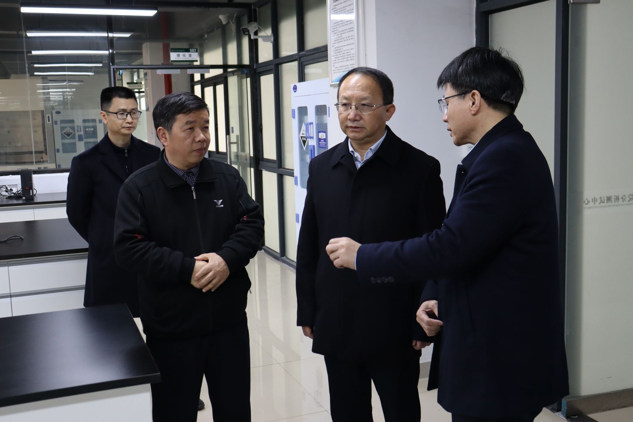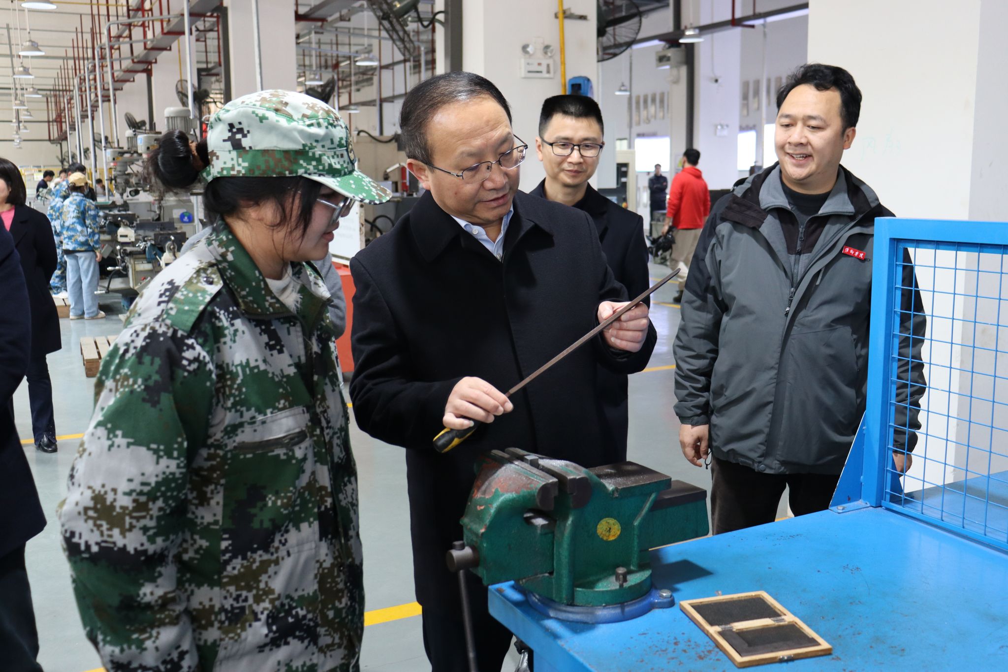 王少玄一行先后前往天泉楼一楼工程训练中心、五楼分析测试中心以及十一楼虚拟仿真数字化智慧实训实践中心。在调研过程中,王少玄详细询问了学校产教融合的开展情况,深入了解学生就业创业的实践模式与创新成果。他强调,高校应全面落实立德树人根本任务,充分利用江西本地的红色文化资源,特别是打造具有安源红色文化特色的思政课,增强思政教育的针对性、吸引力和感染力,培养学生正确的价值观和职业观。