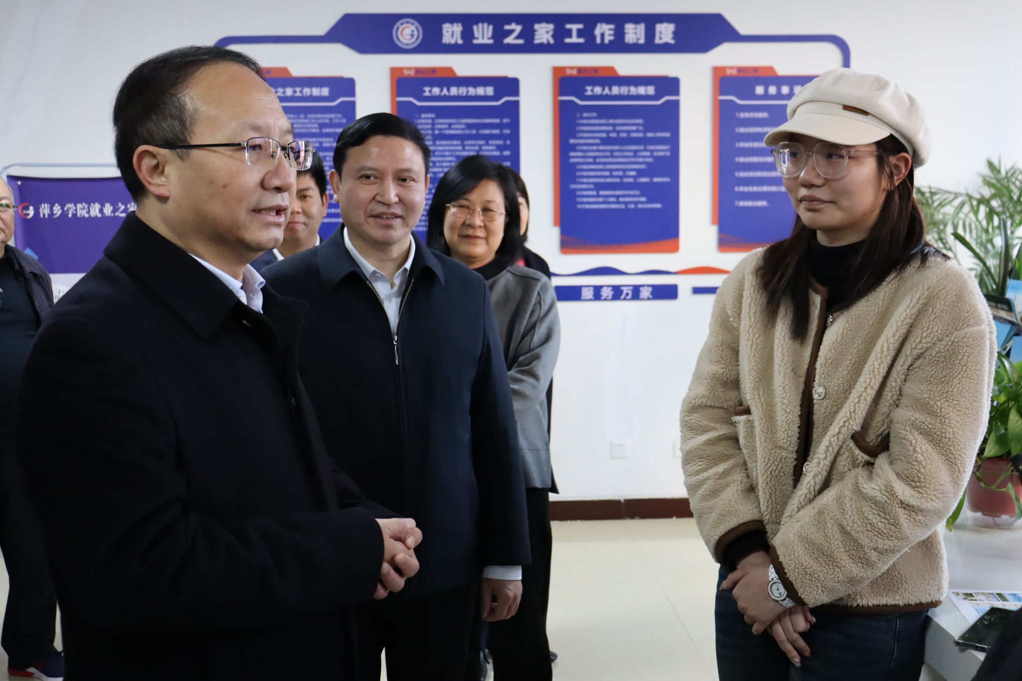 随后,王少玄一行来到至善楼一楼“5+2就业之家”,专题调研学校促进大学生就业创业工作。在就业之家服务大厅,王少玄亲切地与在现场咨询的毕业生交流,询问他们的就业意向、考研情况和存在的困难等。