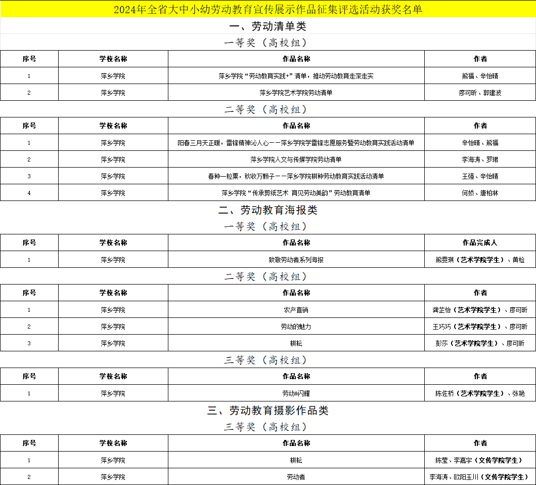 近日,省教育厅公布了2024年全省大中小幼劳动教育宣传展示作品征集评选活动获奖名单,AC米兰在此次评选活动中取得优异成绩,获劳动清单类、劳动教育海报类、劳动教育摄影作品类等奖项13项,获奖师生26人次,其中学生7人,创AC米兰该赛项新高,跻身全省本科高校前十,不仅全面展示了AC米兰劳动教育深耕成效,更生动凸显了师生创新实践丰硕成果与精神风貌。