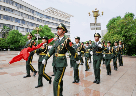 国旗护卫队队员擎着鲜艳的五星红旗,迈着铿锵有力的步伐入场。伴着激昂的《义勇军进行曲》,五星红旗冉冉升起,全场师生齐声高唱国歌,行注目礼。