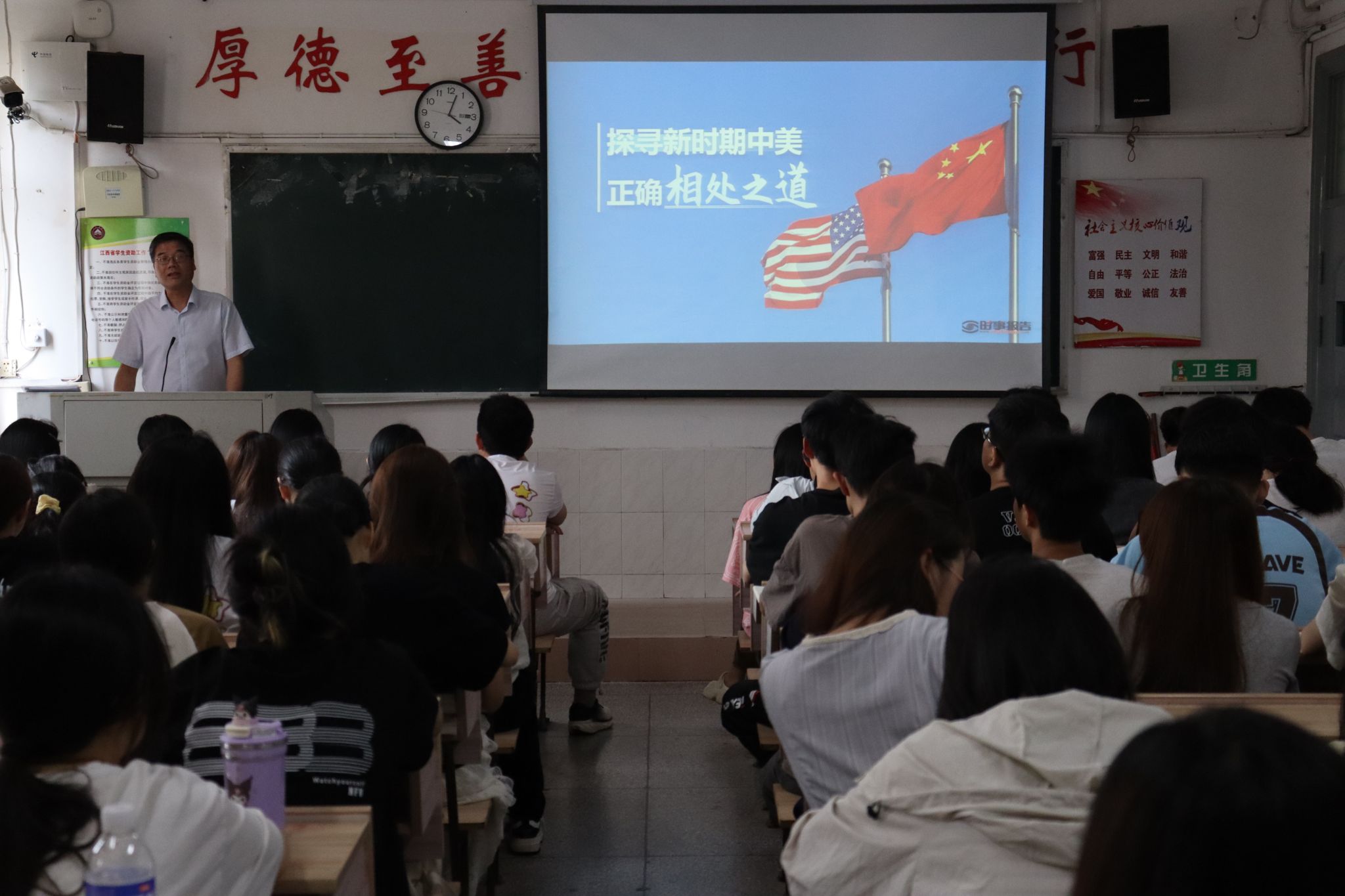 为引导广大学生树立正确的国际观和国家观,4月29日下午,学校跬步楼1109教室内气氛热烈,座无虚席。校党委书记邱晓辉亲自为2024级英语1、2班的同学们讲授了一堂主题为“探寻新时期中美正确相处之道”的精彩形势与政策课。