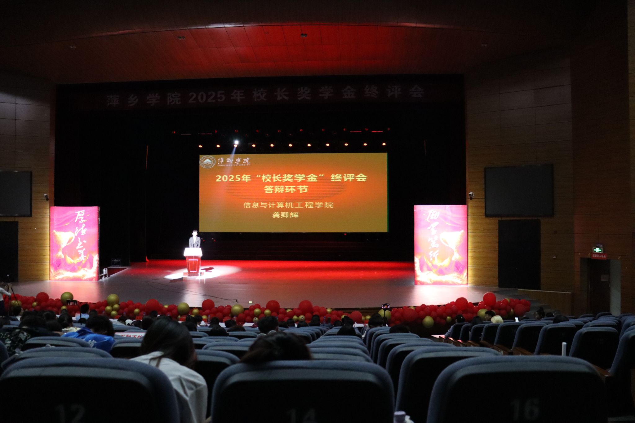 现场气氛热烈,座无虚席。来自11个学院的15名候选人按抽签顺序依次上台,从学业成绩、科技创新、社会实践、道德风尚等多个方面进行个人展示及答辩。他们或娓娓道来,或慷慨激昂,淋漓尽致地展现了青年学子锐意创新、严谨求实的专业素养和追求卓越、知行合一的实践能力,通过分享个人成长中的抉择与坚守,深刻诠释了新时代青年应秉持的奉献、坚韧、求真的价值追求。现场掌声雷动、精彩纷呈、高潮迭起。这场终评会不仅是一次智慧与才华的角逐,更是一次视野的开拓与信念的淬炼。