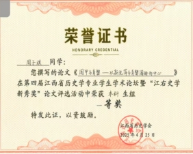 13 | 2025年4月 | 周于琪 | 第四届江西省历史专业学生学术论坛暨“江右史学新秀奖”论文评选活动一等奖 | 省级 |