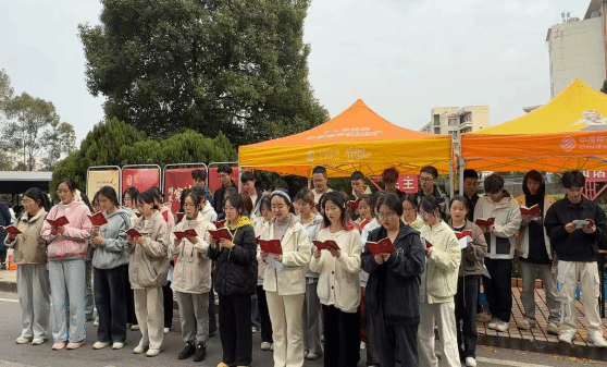 在学校文廷式小广场,来自商学院知识产权专业的学生们自发走进宣传一线,通过发放宪法宣传册、举行宪法调查问卷比赛、宪法知识竞赛和宪法横幅签名活动等活动,向全校同学分享所学,充分调动起了师生们的积极性,让师生们对宪法中的条例有了更深层次的认识。同时,将学校反诈、消防安全等主题宣传与宪法知识竞答相互交融,精准对接学生们的校园生活需求,让学生们通过身边的案例筑牢安全防线。“作为法律相关专业的学生,我们不仅要自己学法知法懂法,更要做好法律的捍卫者和传播者,告诉身边人用法律守护自己和同学的成长。”来自商学院知识产权2501班的余辉同学这样说道。