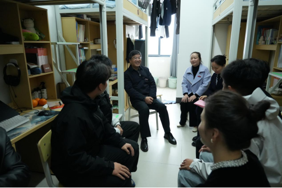 随后,邱晓辉一行来到学生宿舍,与体育教育2301班的同学们围坐一堂,展开零距离座谈。同学们敞开心扉,围绕学业压力、宿舍生活、社团活动、就业规划等话题畅所欲言。邱书记耐心倾听同学们的诉求与建议,对大家在学习生活中遇到的问题逐一回应,并叮嘱同学们要珍惜大学时光,注重身心健康,学会团结互助,在集体生活中锤炼品格、共同进步。后勤与基建处处长徐一峰、党委学生工作部副部长易海峰等相关部门负责人现场回应了同学们关于宿舍设施、生活服务等方面的疑问,表示将持续优化校园服务保障,为学生成长营造良好环境。