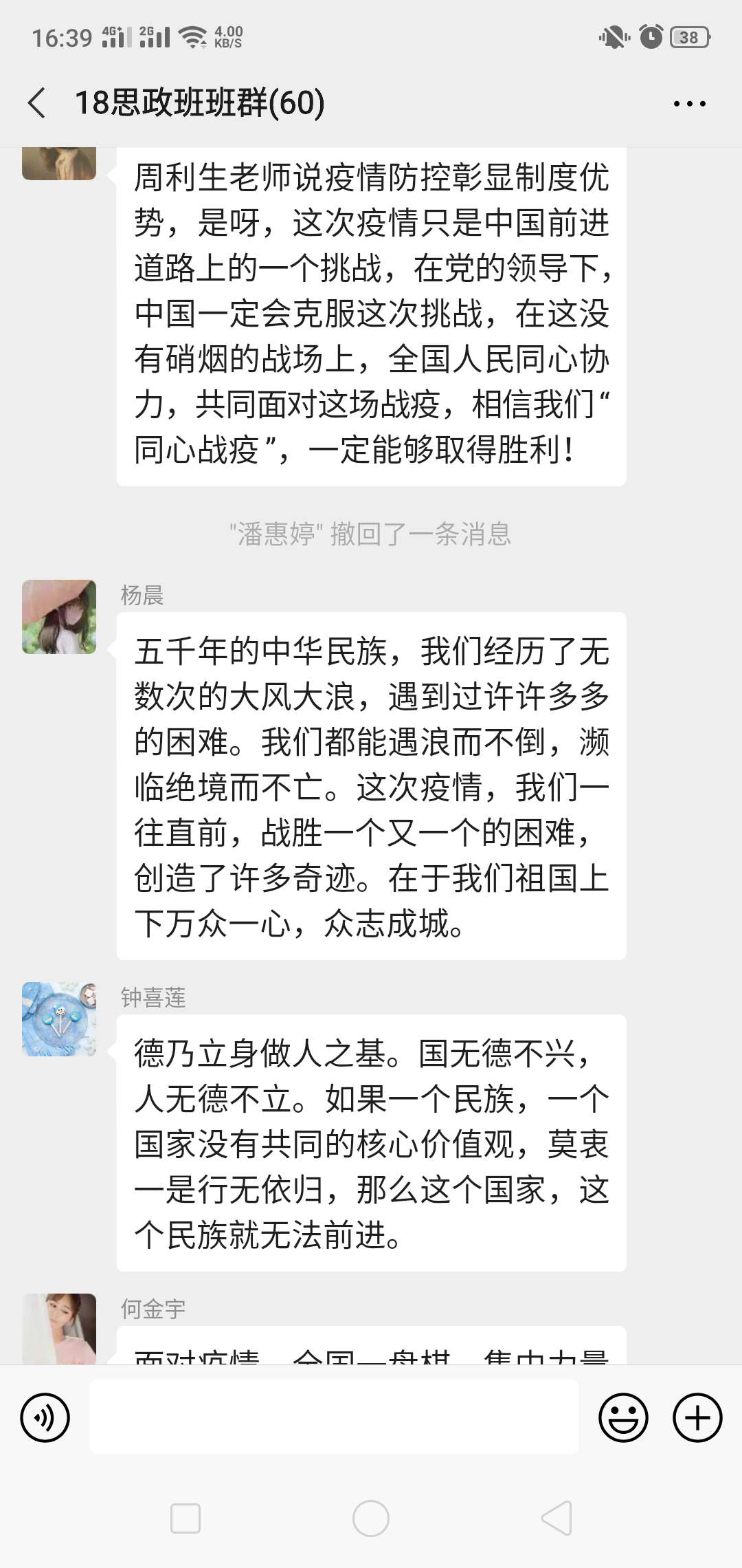 16思政罗发娣:今天,看了同上堂一战“疫”课,让我记忆深刻。对中国在疫情中的担当让我感到骄傲自豪,同时也对江西人民在此次战疫中做出的贡献而自豪。生于这样的国家,何其荣幸?中国战“疫”,凝聚中国力量,彰显大国担当。这力量与担当体现在举国上下一心,不遗余力调配各类资源,力争做到应收尽收、不漏一人;体现在基层社区严防死守,外防输入,内防扩散,不留死角;体现在火神山医院、雷神山医院接连建成,超级速度,超级震撼;体现在战“疫”线屡屡上演“最美逆行”,汇聚中国力量,众志成城,共克时艰。越是苦难越自律,越是艰险越向前。一场重大疫情,也是一场人生大课。我们要科学理性有思想,我们要珍惜生命爱自然,我们要胸怀信仰敢担当,我们一起为大写的青春描绘一个大写的梦想,努力做胸有大志、心有大我、肩怀大任、行有大德的新时代有为青年!
