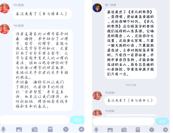 此次活动内容包括书籍图片、书籍简介以及对阅读书籍的感想音频。在交流音频中,各班学生代表积极分享自己的阅读感想,涉及书籍广泛,有马伯庸的《长安十三时辰》、余华的《活着》、高尔基的《我的大学》、沈复的《浮生六记》等等。大家分享的书籍类型不一,题材独特,都是值得一读的佳作。
