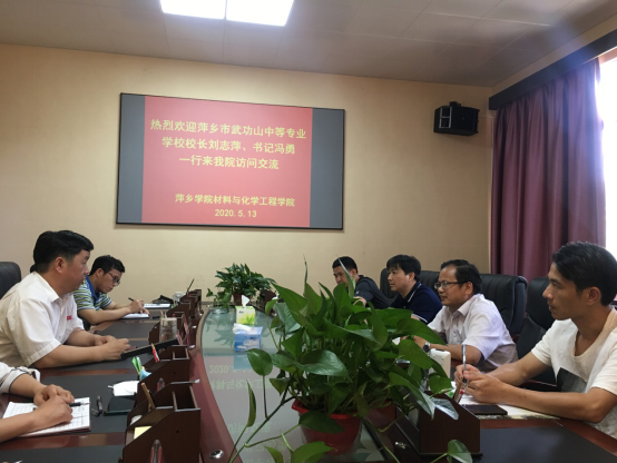 5月13日,萍乡市武功山中等专业学校校长刘志萍、书记冯勇一行4人来到我院访问交流,材料与化学工程学院院长王献忠、党总支副书记向芸及部分老师参加此次交流座谈。双方围绕如何服务地方经济,培养应用型人才展开深入讨论。