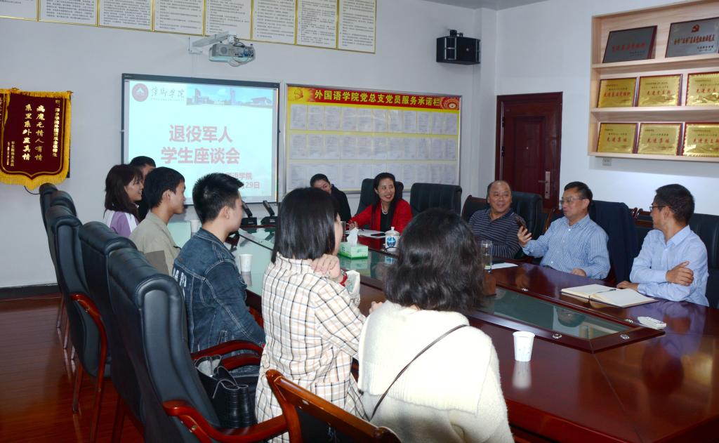为进一步做好退役军人复学学生学习、生活服务工作,发挥他们忠诚、担当模范作用。2020年9月29日下午在英华楼3319会议室召开“退役军人座谈会”。校党委副书记蔡宝琦、院党总支书记黄柏萍、院长欧阳咏梅、院党总支副书记刘佳萍、副院长卓玲及外国语学院退伍军人参加。