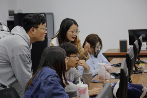 在拍摄工作完成后,相关小组、成员前往鼎新楼实训室进行剪辑工作。首先由摄像组负责人和拷贝素材的同学一起检查、审核拍摄视频素材和照片。随后由后期组的AE小组根据素材制作视频的片头,由PR小组编辑现有的视频素材,将素材剪辑成完整流利的视频。后期组两个小组同时进行工作,整个实践活动现场组员之间齐心协力,互相交流,效率较高。