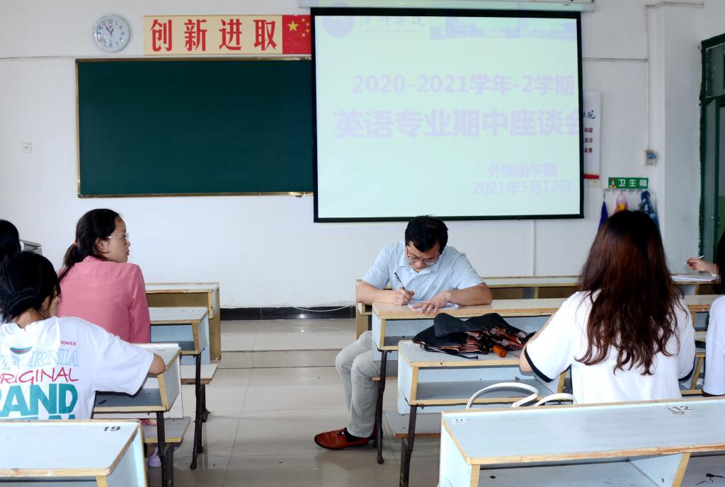 为了全面了解外国语学院及全校外语教学工作状态,加强和规范教学管理,进一步贯彻落实我院党史学习教育,开展好“我为师生办实事”实践活动。外国语学院于5月12日中午在英华楼分专业、分场地召开了2020-2021学年第二学期期中学生座谈会。院党政领导班子、各教研室主任及各专业学生代表等参加了座谈会议。