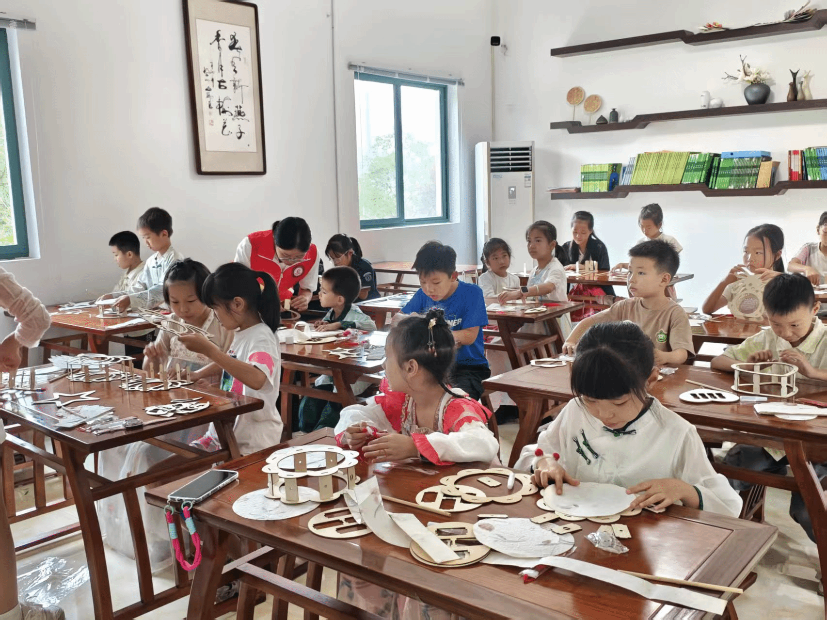 活动的高潮当属非遗手艺体验环节。志愿者向孩子们展示了“花草灯笼”这一非遗艺术品——它融合了中国传统花灯的造型之美与古法造纸的技艺精髓,作为汉代花灯文化的传承与创新,常用于元宵节、中秋节等传统节庆,象征着团圆美满与吉祥如意。在志愿者的耐心指导下,孩子们兴致勃勃地动手制作:从挑选干花、摆放图案,到固定灯架、组装灯笼,每一个步骤都小心翼翼,饱含着对非遗文化的好奇与热爱。当一个个独一无二的花草灯笼在手中完成,