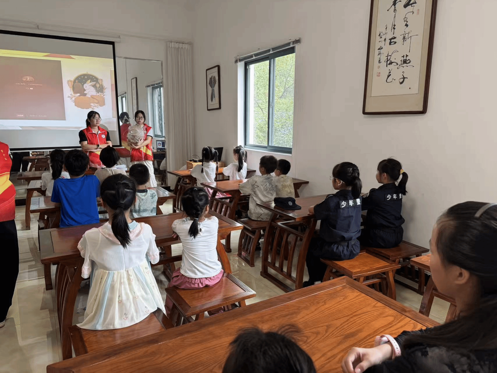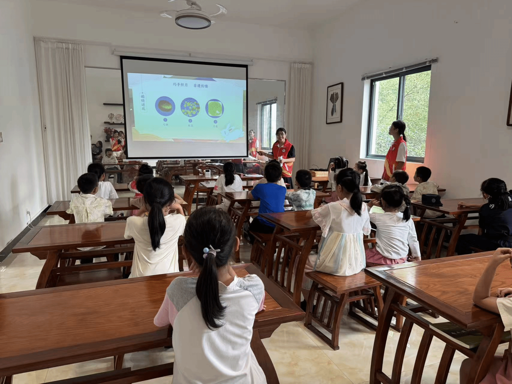 猜谜环节过后,志愿者化身“文化讲解员”,为孩子们讲述中秋节的起源与内涵。从古人对月亮的天象崇拜,到中秋与春节、清明节、端午节并列为中国四大传统节日的文化地位,再到《嫦娥奔月》里嫦娥奔月、玉兔捣药的浪漫神话,志愿者用生动的语言将中秋故事娓娓道来,孩子们听得入神,对“团圆”二字有了更深刻的理解——每逢八月十五,家家户户摆上月饼、瓜果等祭品,向月祈福,期盼平安,这一天也成为了亲人团聚、共享天伦的重要时刻。志愿者还进一步阐释“团圆”文化的深层意义:它以家庭为核心,承载着中国人对血脉亲情的珍视,更延伸出“家国同构”的价值理念,将小家的和睦与国家的繁荣紧密相连。
