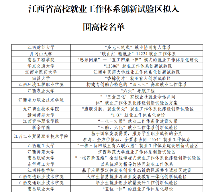 扎实推进试验区建设,开拓就业工作新局面。为推动各高校就业工作向抓育人、服务、指导、统计和体制一体化建设转变,江西省教育厅全面启动高校就业工作体系创新试验区建设,印发了《关于公布江西省高校就业工作体系创新试验区评选结果的通知》。经各高校申报,省教育厅组织评审公示,南昌大学等22所高校入选。对于入选高校,省教育厅将给予建设经费支持,按照省级教改课题重点项目予以立项,并列入省属高校年度综合考核就业工作的重要观测点。这是我省今年推进高校就业工作体系化建设的一项重要内容,以实现就业工作体系化、全员化、全程化为目标,进一步完善并创新就业工作体系,力争把这项工作打造成全省高校就业育人品牌。