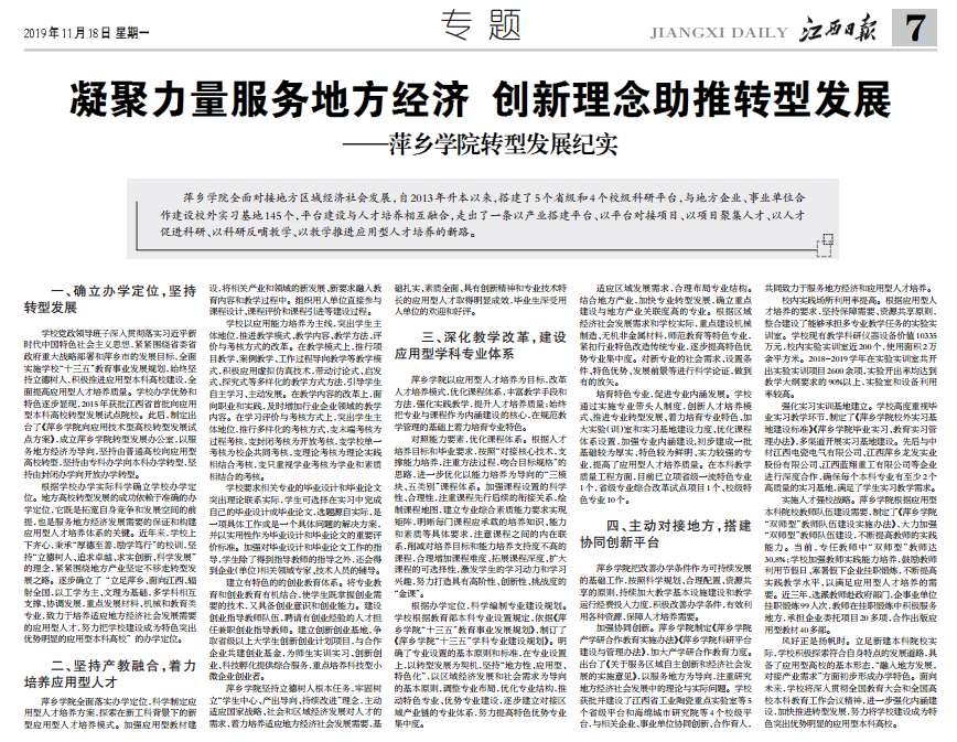 学校党政领导班子深入贯彻落实习近平新时代中国特色社会主义思想,紧紧围绕省委省政府重大战略部署和萍乡市的发展目标,全面实施学校“十三五”教育事业发展规划,始终坚持立德树人,积极推进应用型本科高校建设,全面提高应用型人才培养质量。学校办学优势和特色逐步显现,2015年获批江西省首批向应用型本科高校转型发展试点院校。此后,制定出台了《AC米兰中文官方网站向应用技术型高校转型发展试点方案》,成立AC米兰中文官方网站转型发展办公室,以服务地方经济为导向,坚持由普通高校向应用型高校转型,坚持由专科办学向本科办学转型,坚持由封闭办学向开放办学转型。