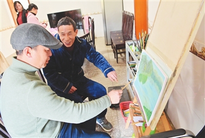 村民陈云发(右一)跟张佰桥学习油画后,创作出20多幅作品。