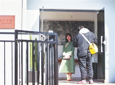 1月13日,一游客来到艺术家工作室拍照。
