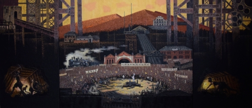 这幅油画长4.2米,高1.8米,是唐柏林老师历时8个月的时间,以闻名全国的安源路矿工人大罢工为题材,精心创作的一幅美术作品。作品构思巧妙,采用了“三联画”的艺术形式,中间展现了大罢工的宏大场景,两侧则是旧时安源工人的劳动景象,反映了他们在党的领导下团结一心、奋起斗争的历程。