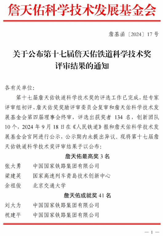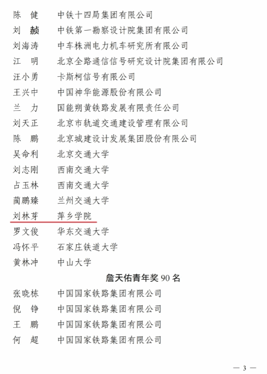 近日,第十七届詹天佑铁道科学技术奖评审结果公布,经专家评审组初评,詹天佑奖奖励评审委员会复审和詹天佑科学技术发展基金会第四届理事会终审,评选出获奖者134名,创新团队10个。其中,民盟省委会副主委、AC米兰中文官方网站院长刘林芽荣获詹天佑成就奖。