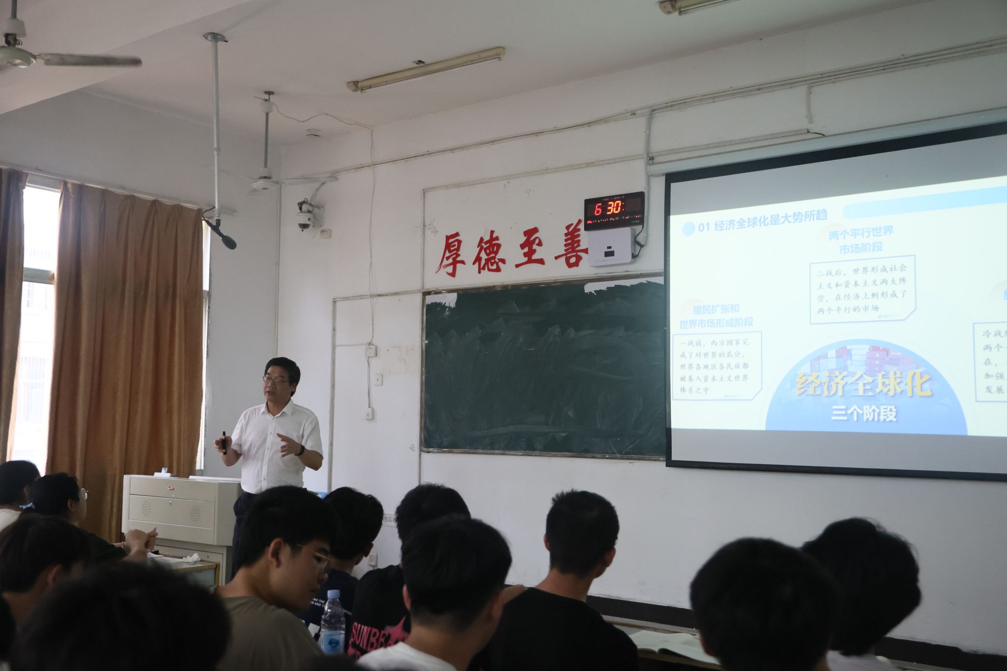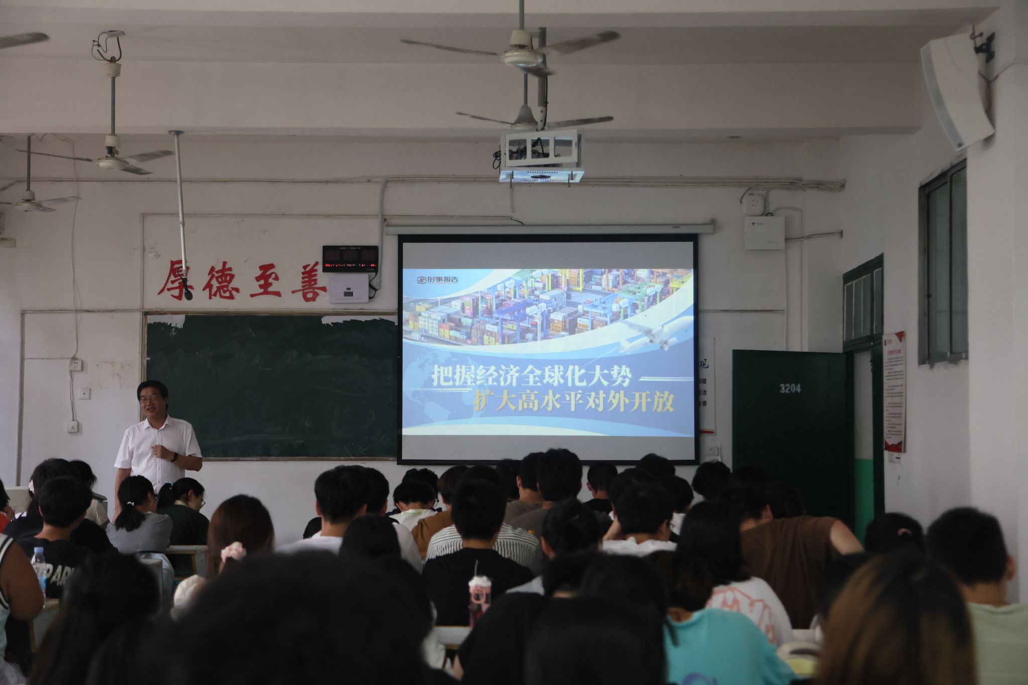 邱晓辉以《把握经济全球化大势 扩大高水平对外开放》为题,从“不可阻挡的历史潮流”“破解困局的中国方案”“繁荣发展的必由之路”三个方面向同学们讲述了经济全球化的发展阶段和新特点新趋势,介绍了破解经济全球化困境的中国方案,展示了通过开放推动世界繁荣发展的中国担当。他指出,经济全球化是当今世界经济发展的主要趋势之一,是社会生产力发展的客观要求和科技进步的必然结果。希望同学们深刻认识坚持经济全球化正确方向、扩大高水平对外开放,既是对经济规律的深刻把握,也是对历史潮流的自觉顺应。他寄语同学们,要将个人的未来与国家和民族的未来紧密相连,在实现个人价值和梦想的同时,为国家的繁荣发展贡献自己的力量。同学们纷纷表示,作为新时代青年,将始终坚持树立正确的世界观、人生观、价值观,将个人的理想与国家的命运紧密结合起来,勇做走在时代前列的奋进者、开拓者、奉献者。