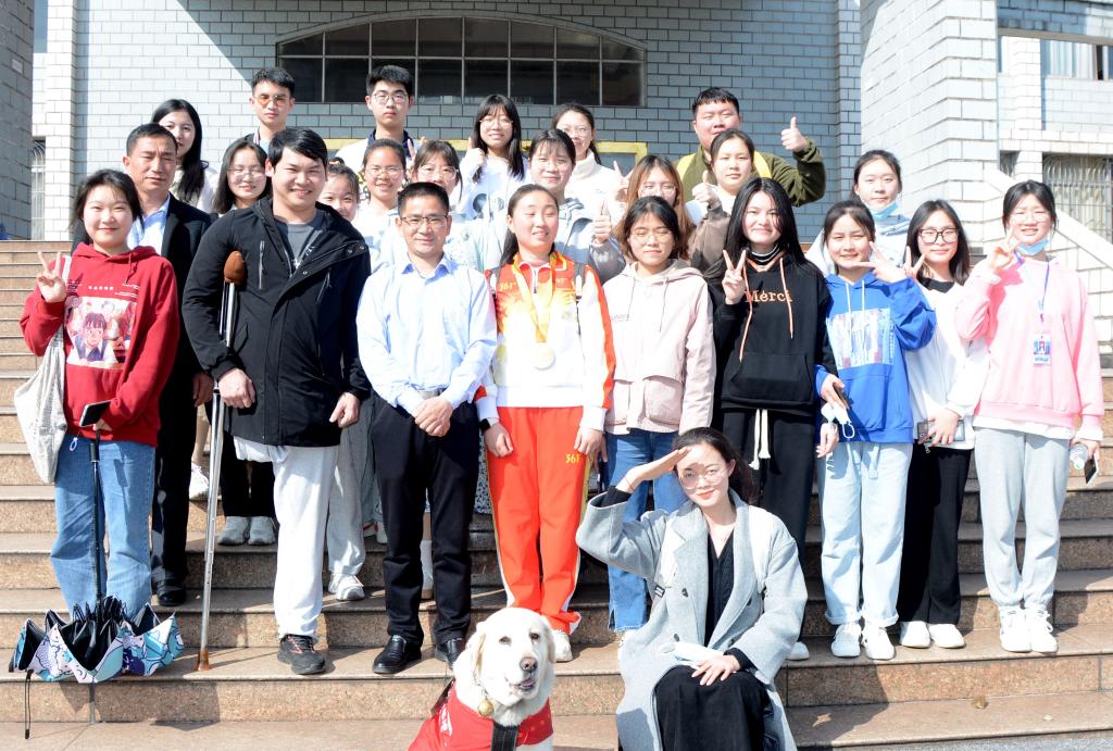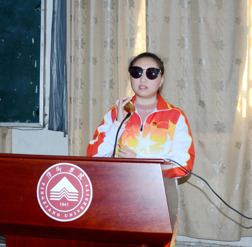 她深情的说到:金牌挂在胸前,我深感光荣,这份光荣属于党和人民。她分享了退役后的选择,为萍乡的盲童教育填补了空白;担任盲人协会主席,积极参加志愿服务,让更多的人感受到了阳光的温暖。她勉励同学们奋勇争先,不怕困难,把自己的梦想融入到中国梦。