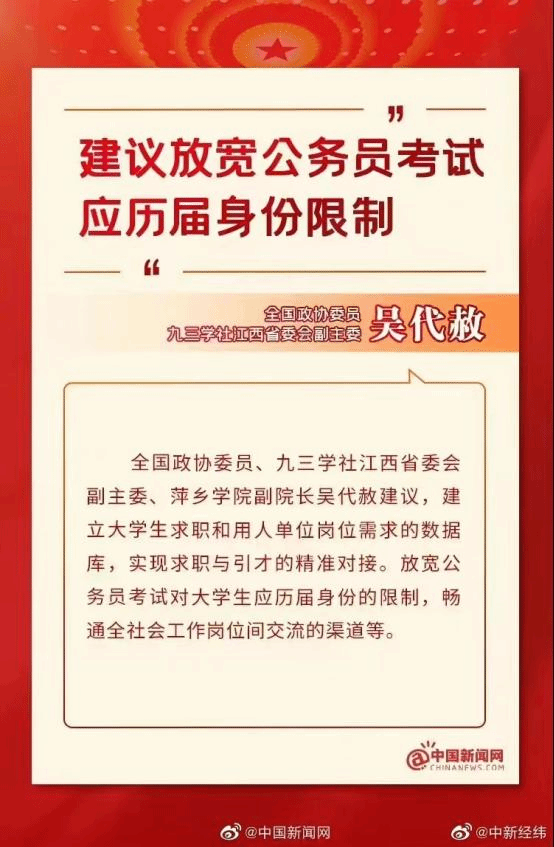 吴代赦说:“大学生就业问题是社会关注焦点。经调查发现,不少大学生未在毕业后马上就业,并非找不到工作,而是希望通过自我提升以便更加契合就业市场;公务员考试及选调生选拔对应历届身份的要求,也制约着毕业生就业选择。”他建议,建立大学生求职和用人单位岗位需求的数据库,实现求职与引才的精准对接;放宽公务员考试对大学生应历届身份的限制,畅通全社会工作岗位间交流的渠道等。(中新网报道)