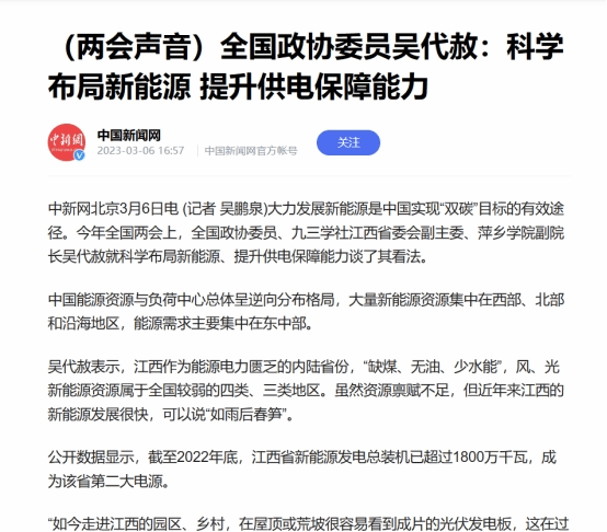 在接受《国家电网报》记者采访时,吴代赦认为,促进新能源高质量发展,必须更好地统筹发展和安全、更好地统筹保供和转型,需要政府、社会、企业等多方协同发力,进一步加强顶层设计,按照循序渐进的原则做好统筹协调,实现新能源又好又快发展。他建议,要立足电力保供和促进能源转型,持续优化江西省能源结构,促进源网荷储协调发展。一方面,要加快推进江西电网与省外大电网的连接通道建设,进一步加大清洁电力引入力度,持续提升跨省跨区的能源互济能力;另一方面,要科学布局省内新能源发展,做好储能、电网接入工程等基础设施建设,实现同步规划、同步建设、同步投产,确保新能源高水平消纳。他表示,要大力倡导绿色低碳的生产和生活方式,政府、企业、学校等要带头养成节能降耗的好习惯,用实际行动守护绿水青山,共建美丽家园。