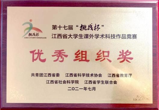 积极组织学生参加“挑战杯”全国大学生课外学术科技作品竞赛和“挑战杯”中国大学生创业计划竞赛。近2年来,荣获省级优秀组织奖2次和二等奖(银奖)7个,三等奖(铜奖)26个,挑战杯“黑科技”专项2件作品冲进国赛并获得行星级等次。与创新创业学院共同组织学生参加中国国际“互联网+”大学生创新创业大赛,荣获国赛铜奖1个,省级金奖1个;荣获了江西省科普讲解大赛优秀组织奖等多个奖项。
